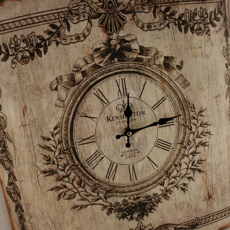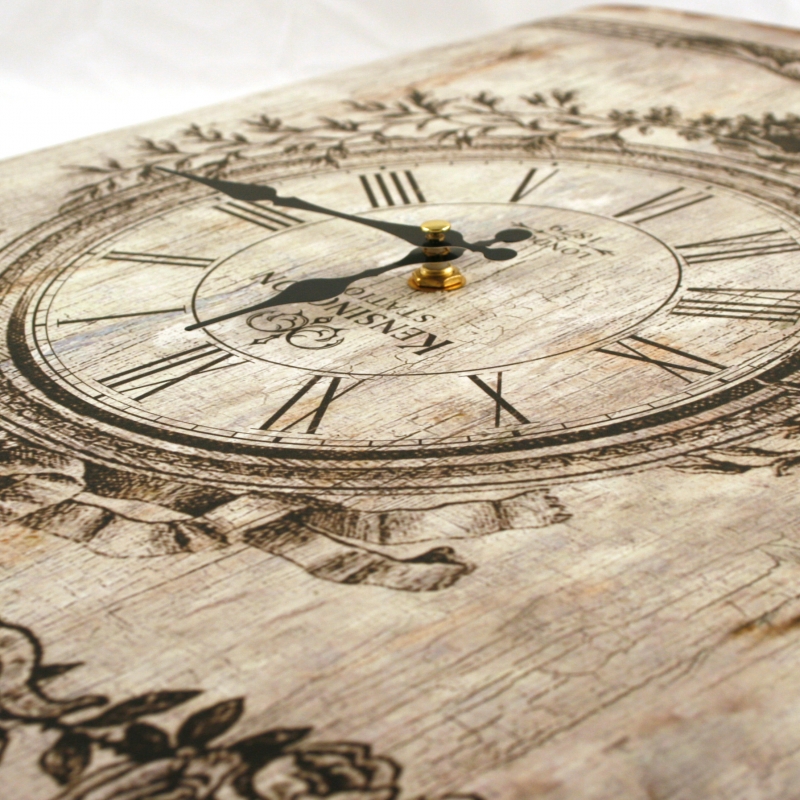 Hodiny Kensington sú absolútne neprehliadnuteľné . Na drevenom obdĺžnikovom podklade o stranách 49 a 44 cm je umiestnený guľatý ciferník s výraznými afické a rímskymi číslicami .
