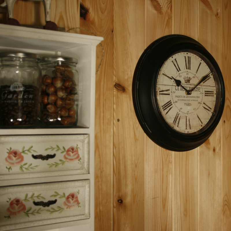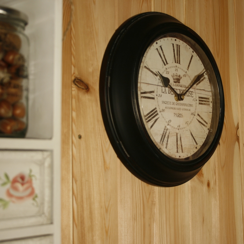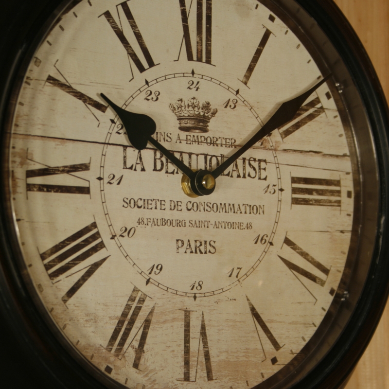 Na hodinách prevláda výrazná čierna farba . Číslice sú rímske a dostatočne veľké . Uprostred ciferníku nájdete ozdobné nápisy .