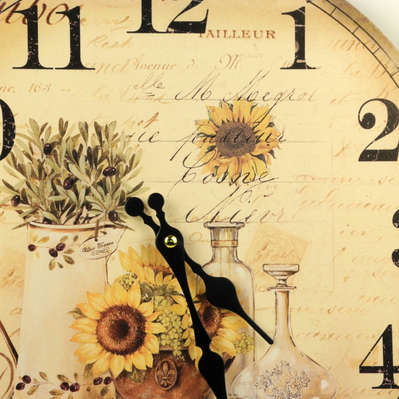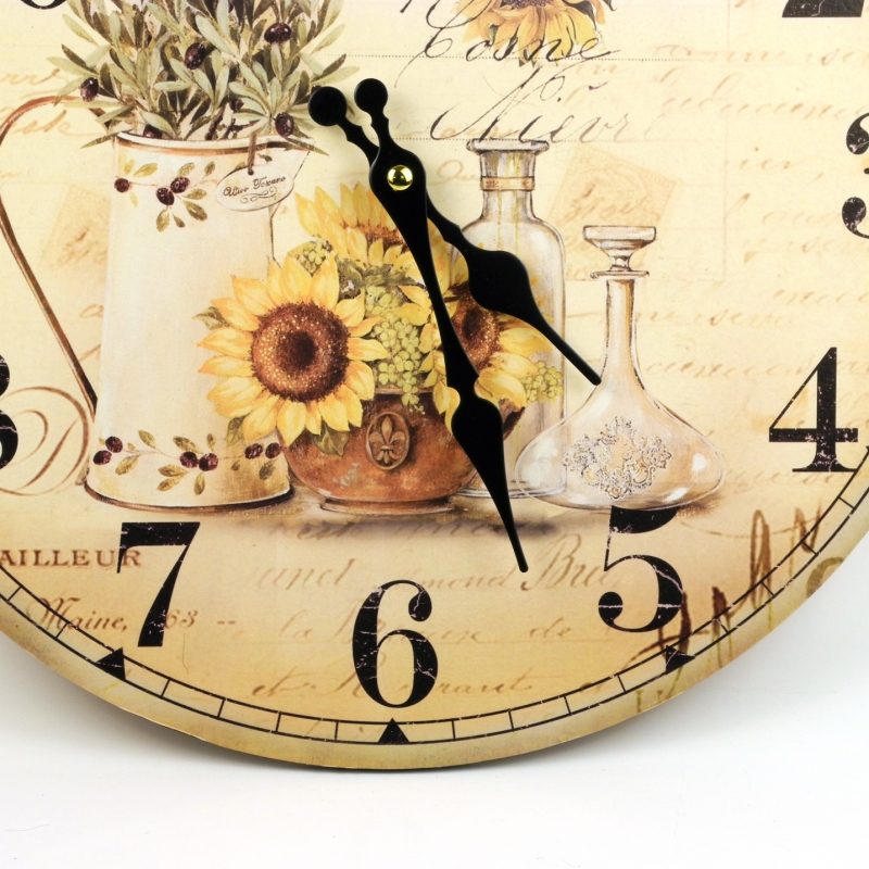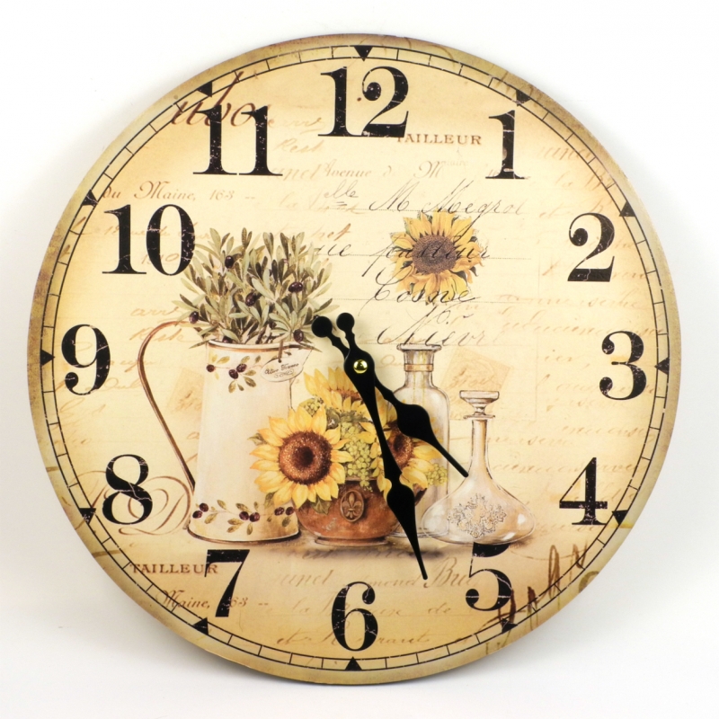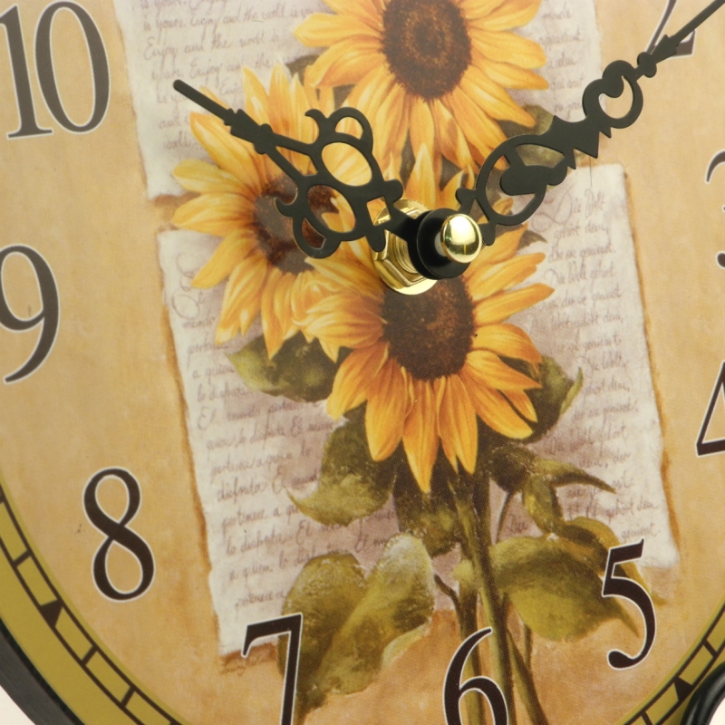 Dřevěné hodiny nástěnné o průměru 34cm. Ručičky o délce 15 a 11,5cm. Dekor slunečnice.