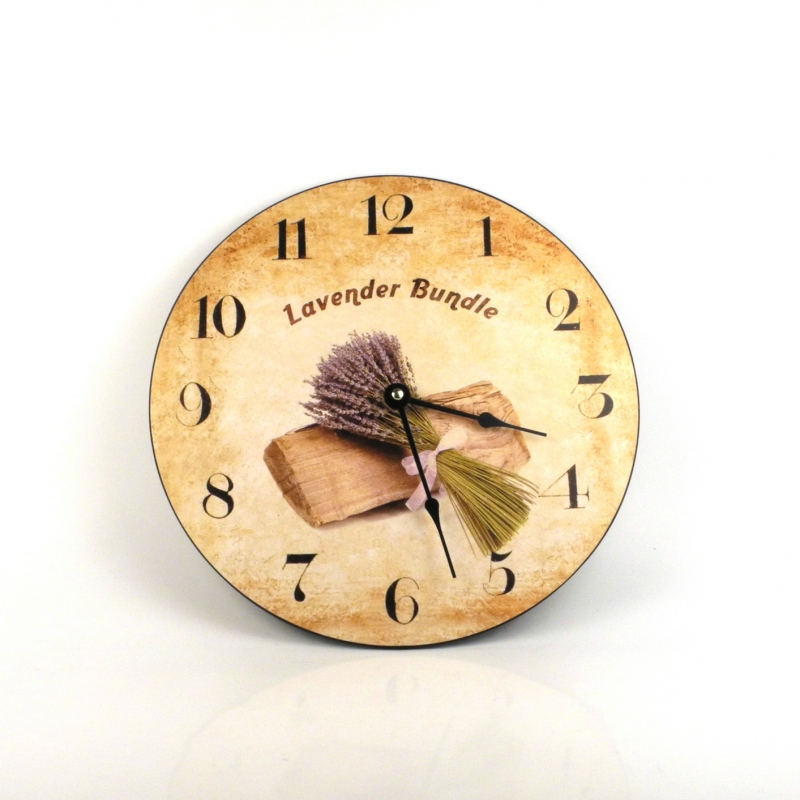 Krásne hodiny v prírodných tónoch s motívom paličku dreva a zväzkom sušenej levandule.