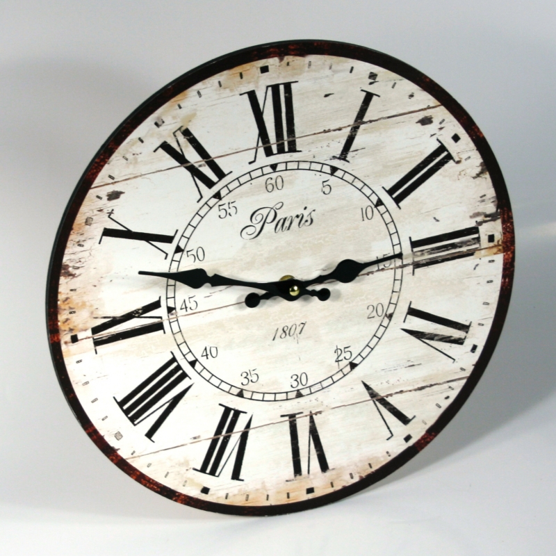 Hodiny nástenné zdobí nápis 1807 . Sú drevené a majú priemer 34 cm . Ich rímske číslice idú ľahko prečítať aj na väčšiu vzdialenosť .