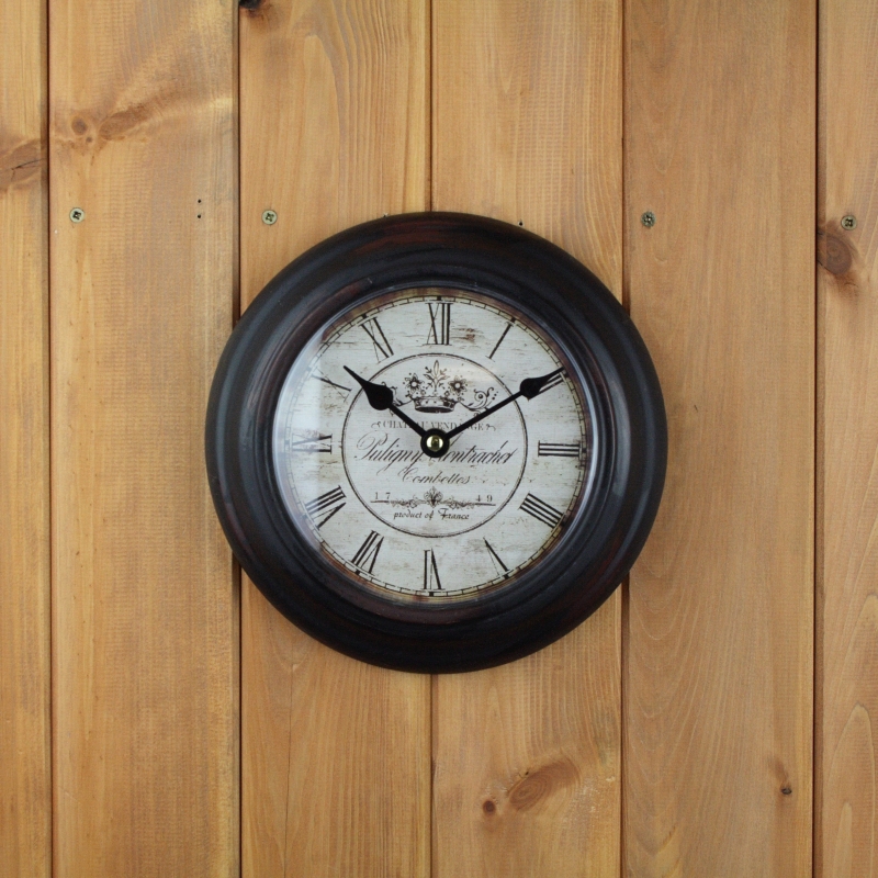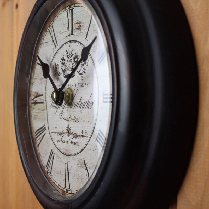 Hodiny s tmavým rámom a ciferníkom s patinou. Ciferník je zdobený nápisom a vo vrchnej časti je umiestnená koruna s kvetinami.