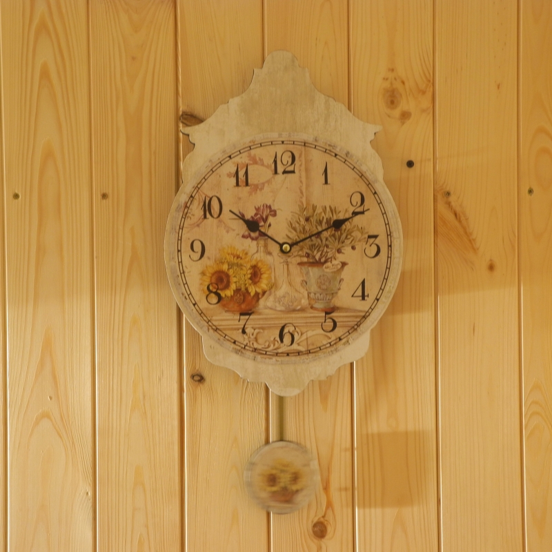 Jejich rozměr je 36x24cm, celková výška i s kyvadlem 50cm.Jak ciferník, tak kyvadlo zdobí veselý slunečnicový motiv, na ciferníku najdeme i jiné květinové dekorace.