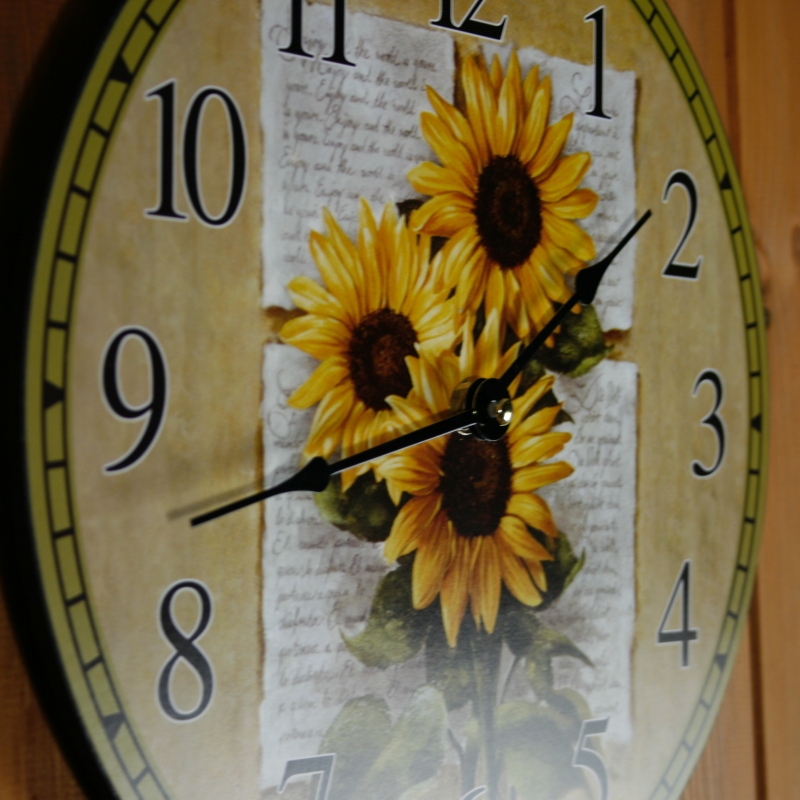 Nástenné hodiny majú žltý podklad , na ktorom sa pekne vynímajú tri rozkvitnuté kvety slnečníc . Leží na liste , vari je v ňom asi napísané?