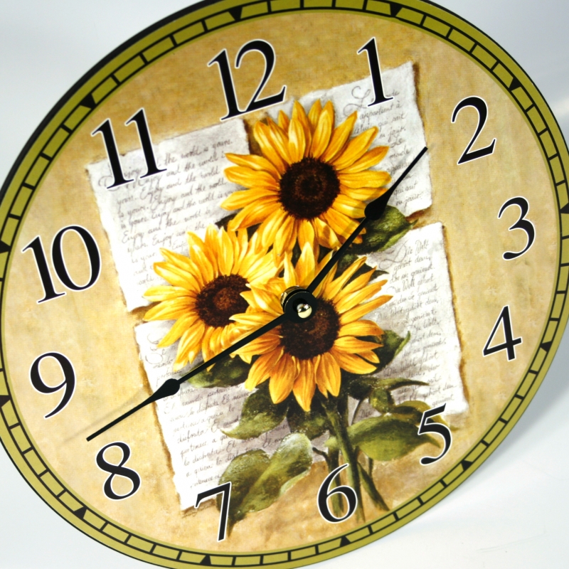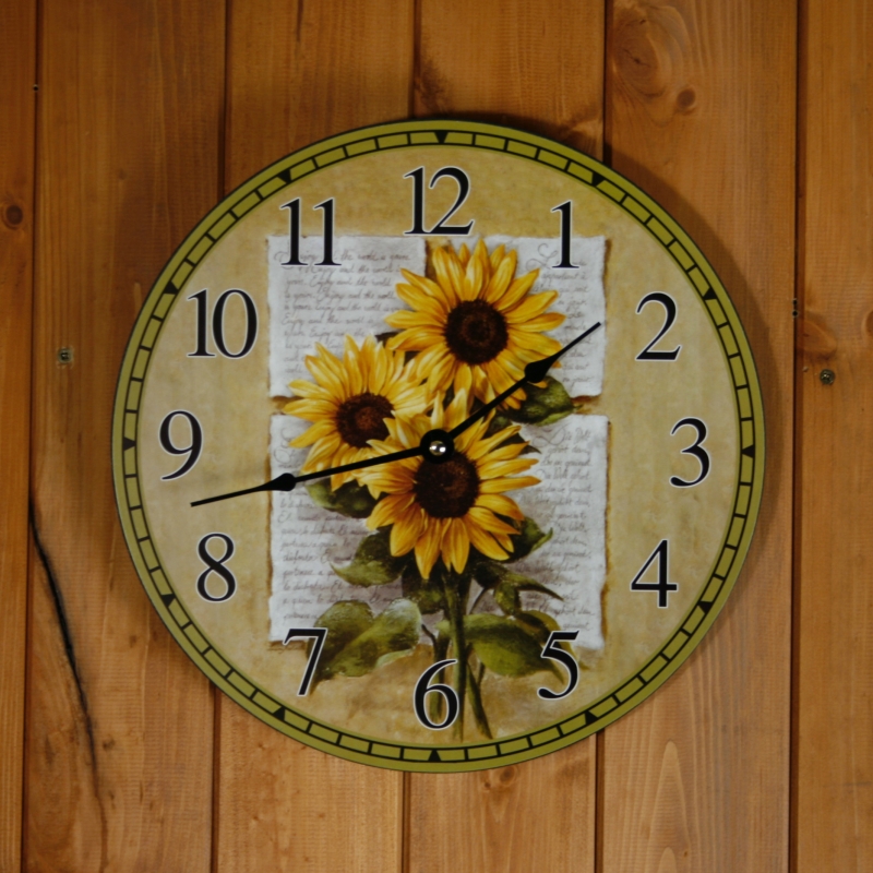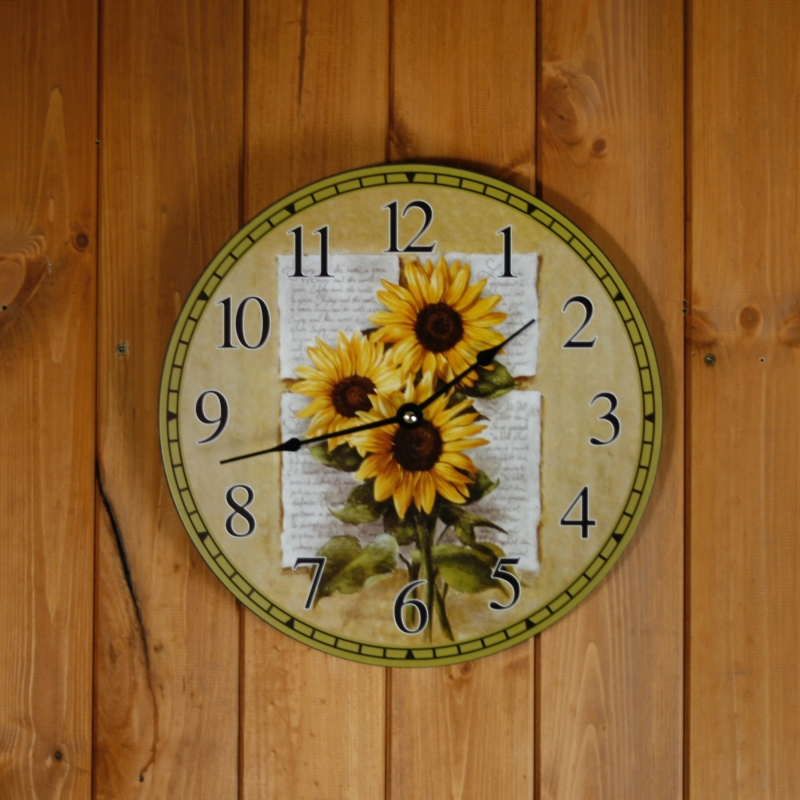 Hodiny nástenné zdobia letné dekor slnečnice . Sú drevené a ich priemer je 30 cm .