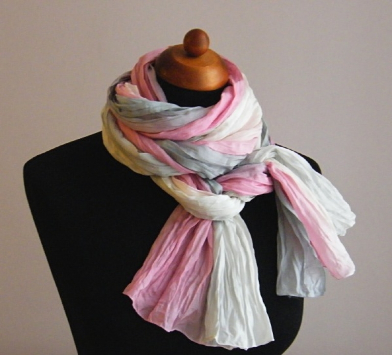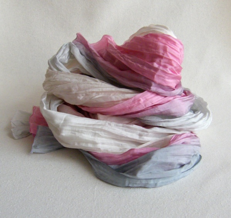 Hodvábna šál príjemné veľkosti 55x200 cm. Šál dá vyžehliť do hladka, podľa chuti a vkusu následne znovu navrapovat.