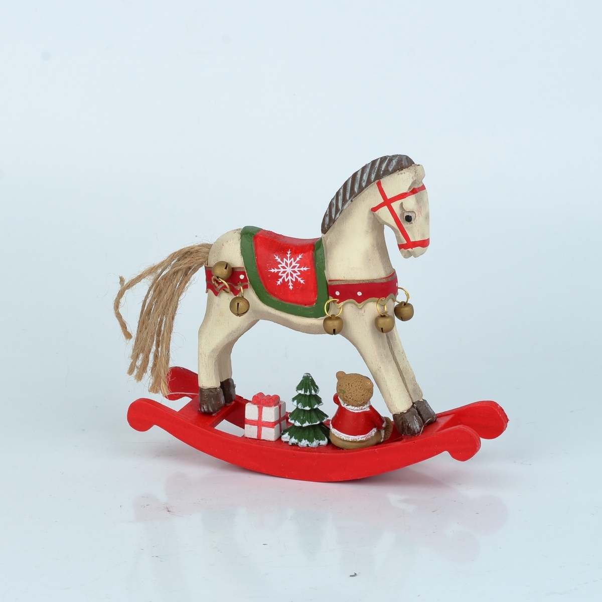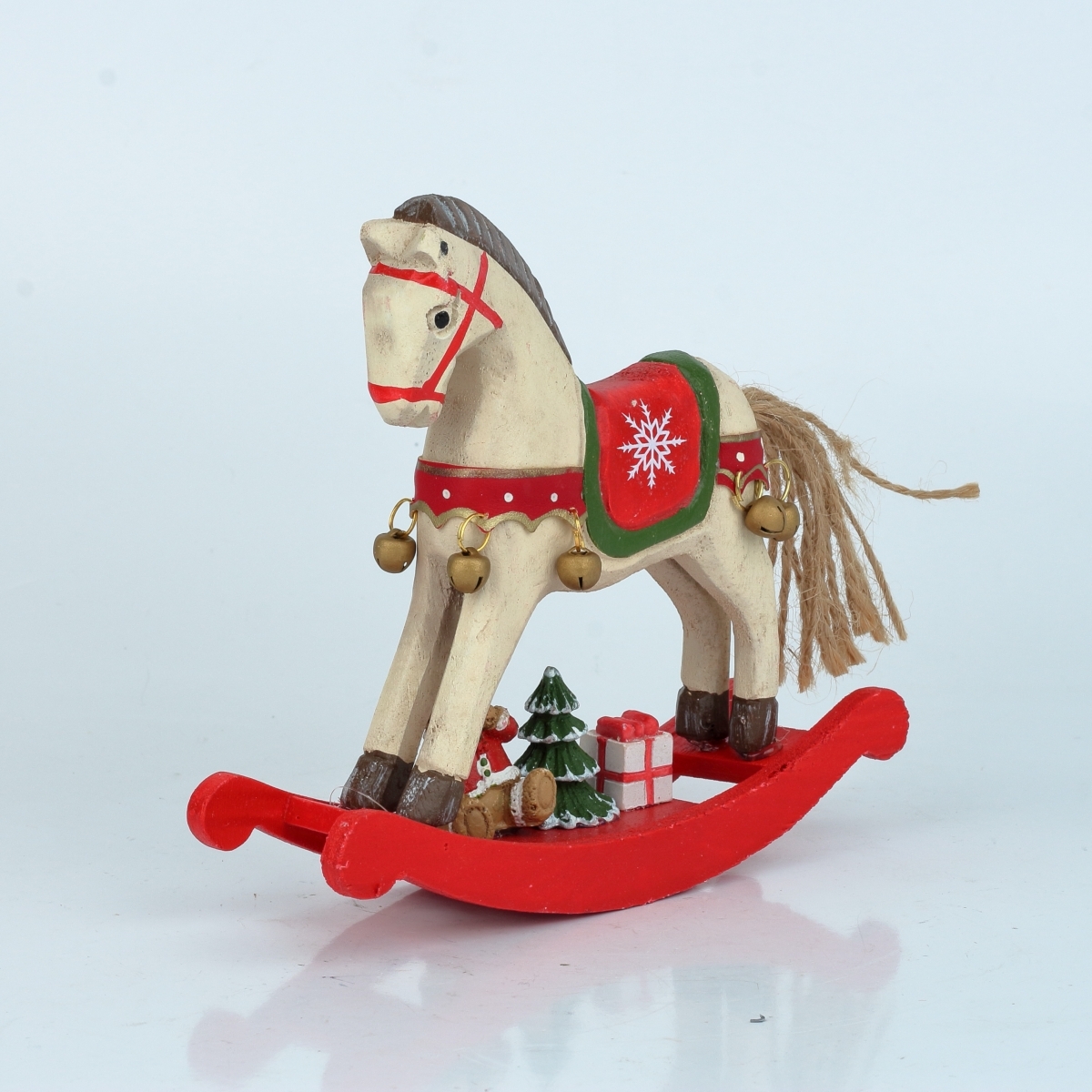 Tento biely hojdací kôň má mnoho krásnych detailov, ktoré spoločne vytvárajú naozaj okúzľujúcu vianočnú dekoráciu. Zelená a červená farba sú tradičnými vianočnými farbami a belušovi veľmi pristanú. Pod koníkom je umiestnený malý stromček darček a mávajúci medvedík v červeno bielom kabátiku.