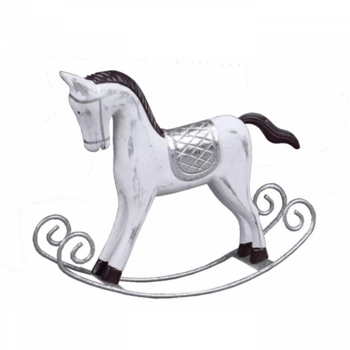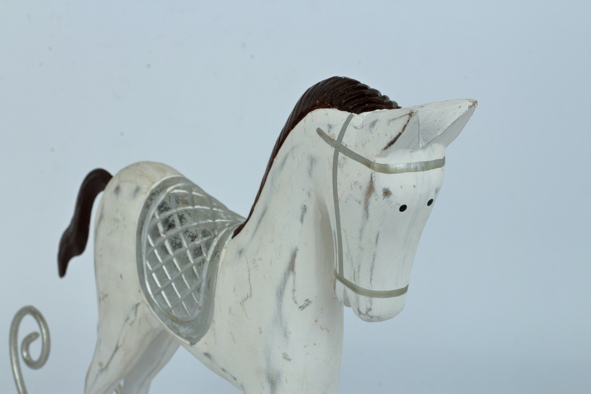 Krásna dekorácia, vhodná nielen na vianočný čas. Biely hojdací kôň s jemnou patinou, má čiernu hrivou a strieborné detaily. Ľahko ho možno kombinovať s ďalšími vianočnými dekoráciami, ale hodí sa aj ako samostatná dekorácia detských izbičiek.