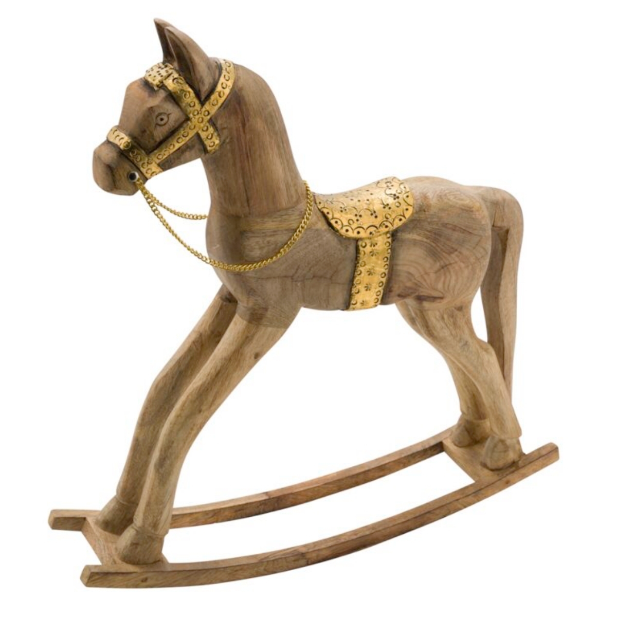 Dekorácia v podobe hojdacieho koňa zaujme kresbou dreva aj nápadnými zlatými detailmi v podobe sedla, ohlávky a uzdy. Hladké drevo totiž tieto ozdobné detaily ešte viac zvýrazňuje.