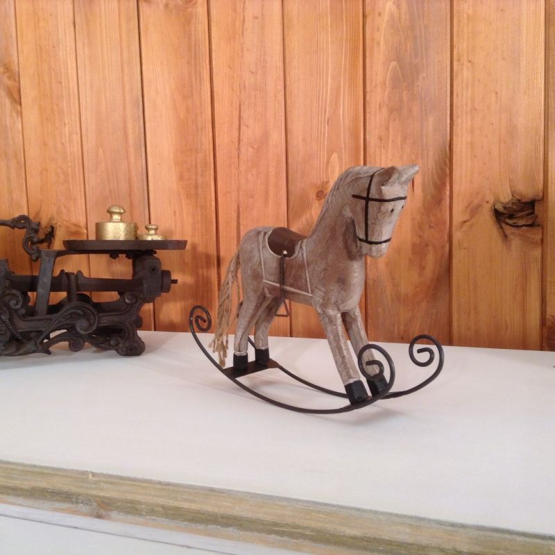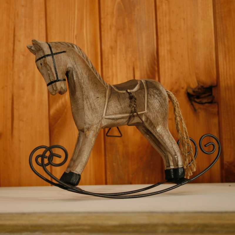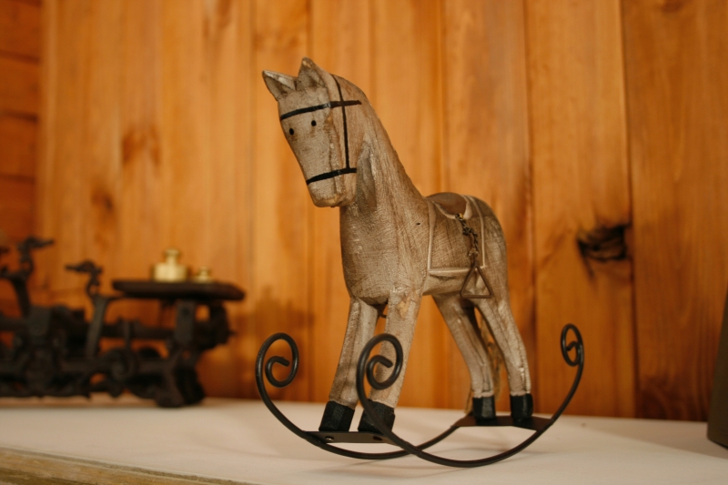 Hojdací koník je drevený , jeho strmene sú kovové a chvost síce nie je srstené , ale vlásie veľmi pripomína .