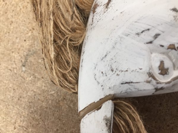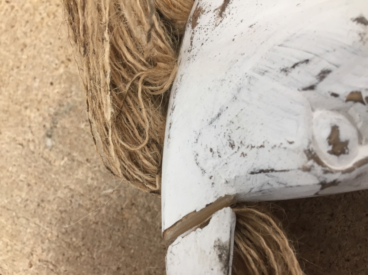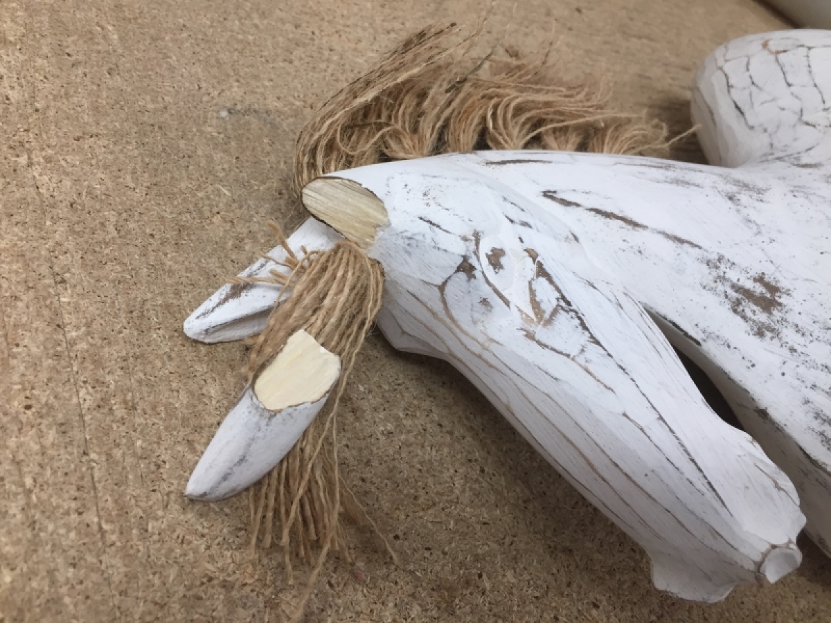 Ouško je součástí a jde snadno opravit přilepením. Z tohoto důvodu byla ale houpací koník vyřazen se slevou 40%.
