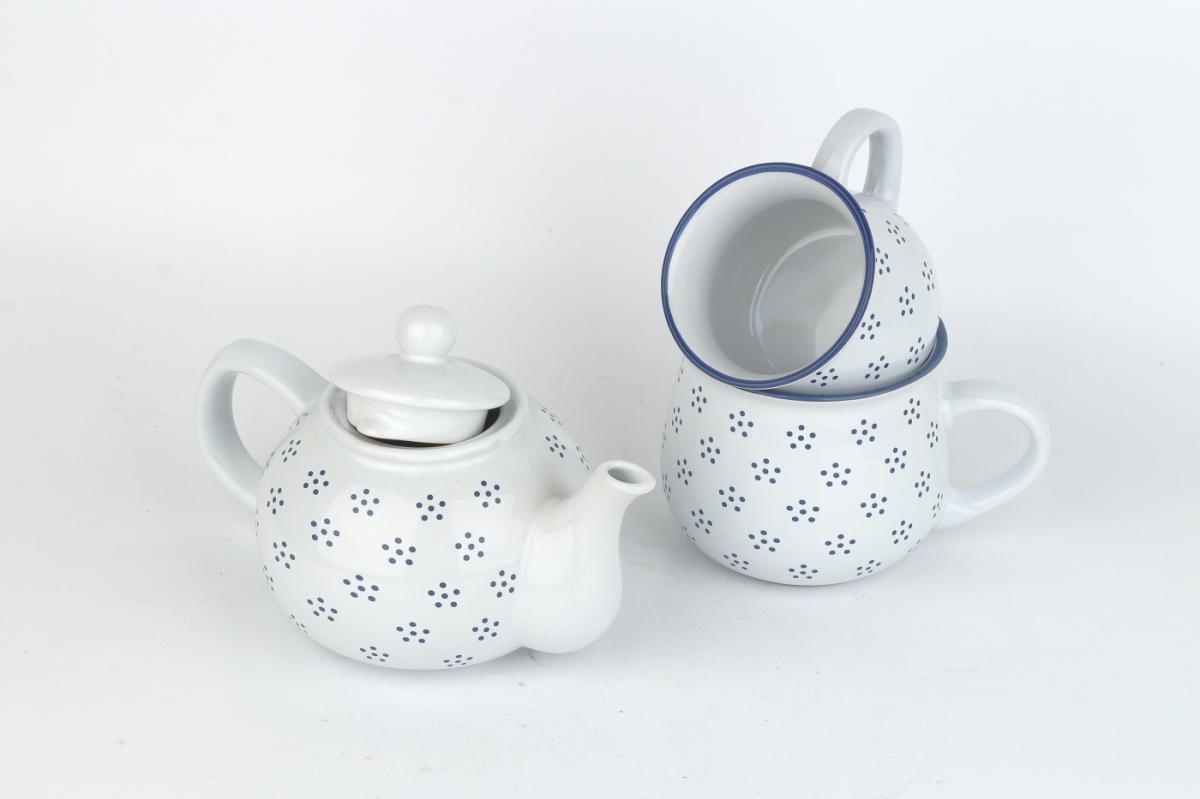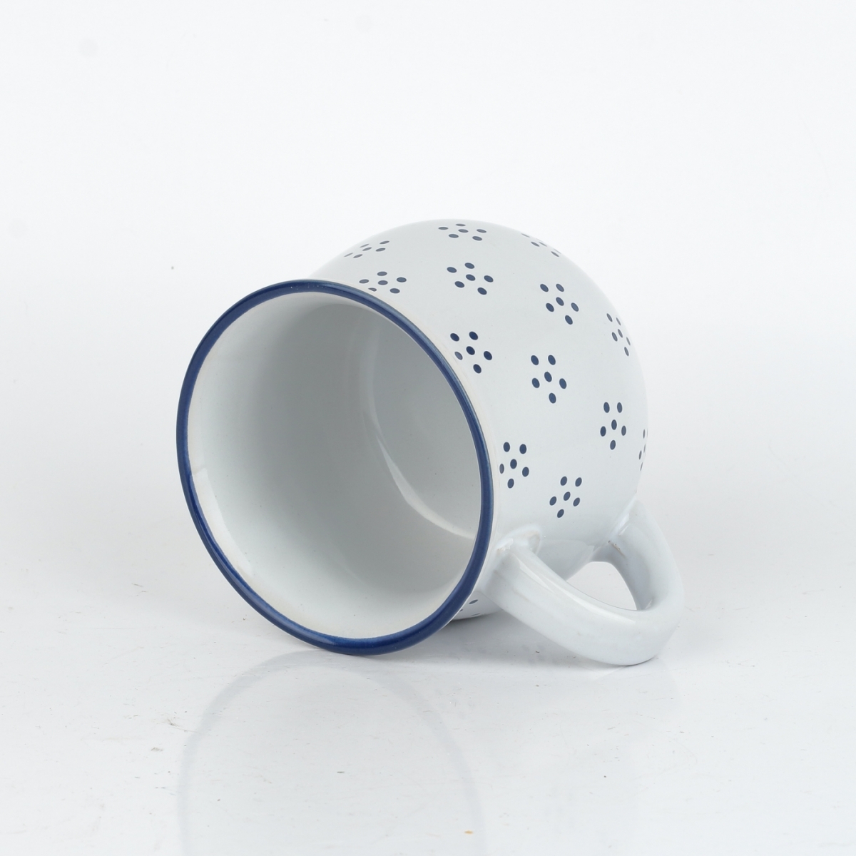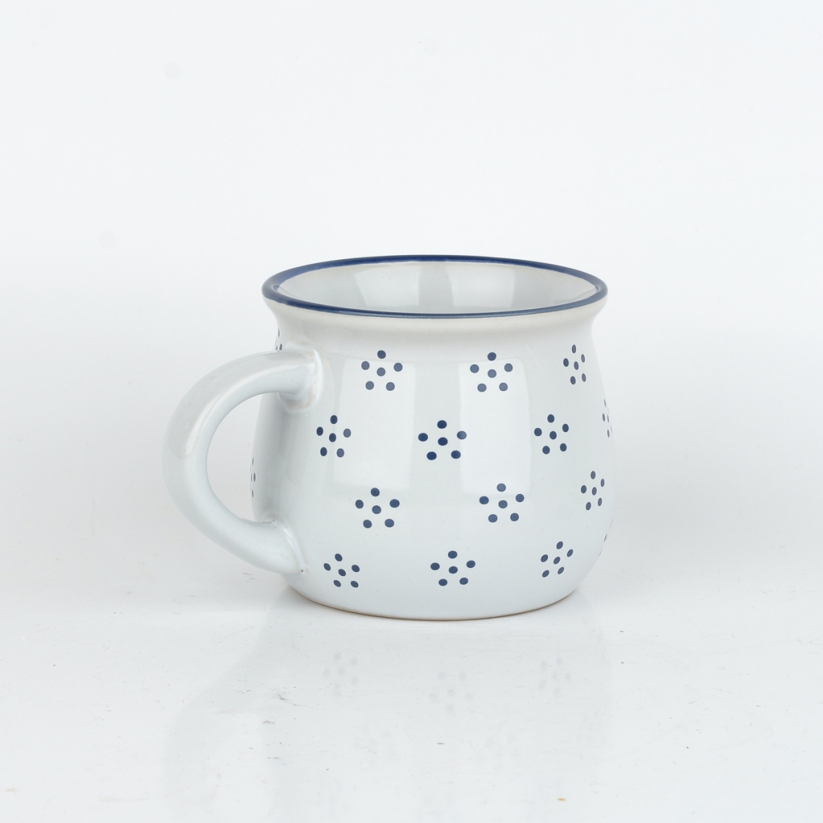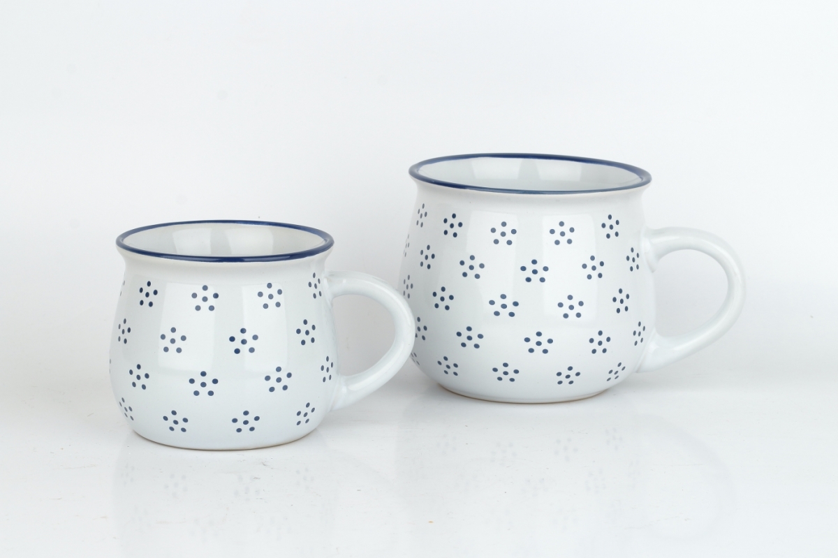 Tento hrnček je ručne vyrobený z kvalitnej keramickej hliny, je opatrený odolnou bielou glazúrou a zdobený drobnými čiernymi bodkami, ktoré sú usporiadané do štylizovaných kvietkov. Jeho tradičný, bucľatý tvar a veľkým uchom, krásne padne do ruky.