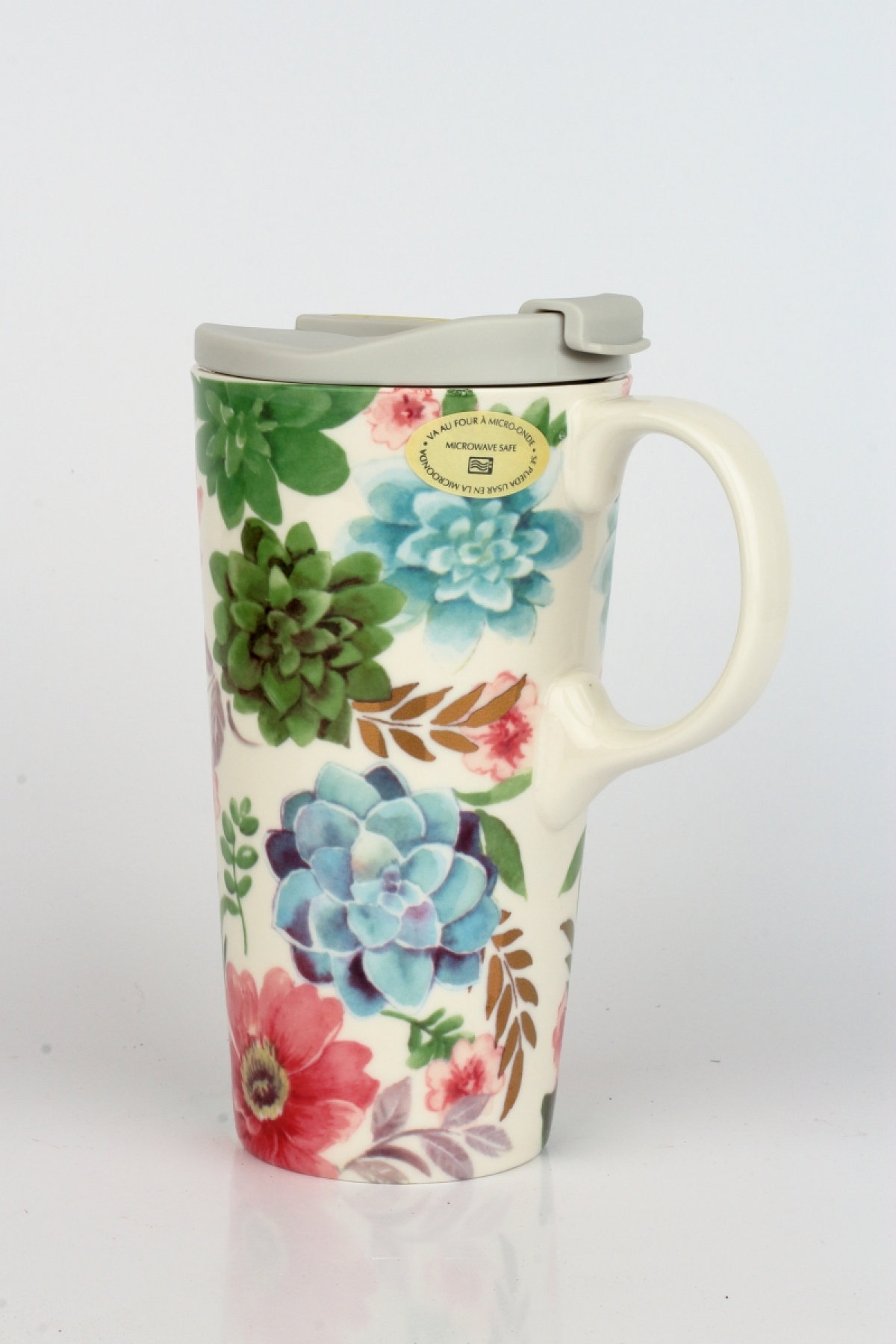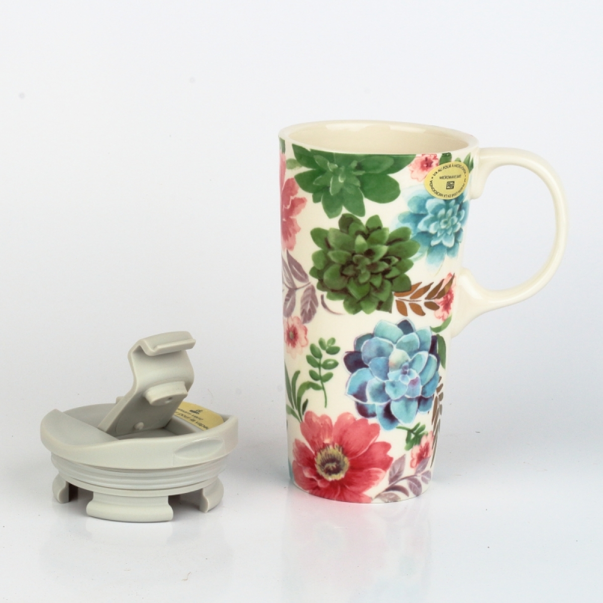 Hrnček cestovné na kávu alebo čaj s motívom rozkvitnutých sukulentov.