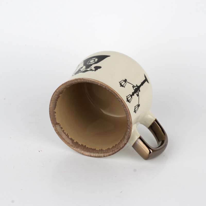 Hrnček na čaj s vintage motívmi hnedý 14x10x9cm má lesklú krémovú glazúru, vnútri hnedú glazúru, bronzové ucho a prekrásne vintage motívy vtáčie klietky, lampy, retro telefónu a pouličné lampy.