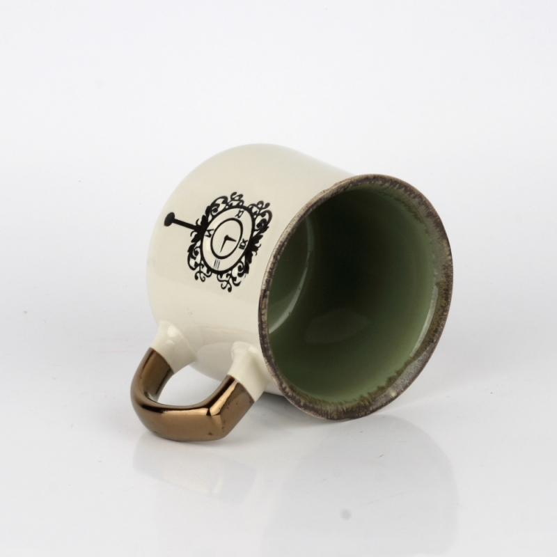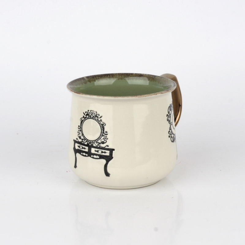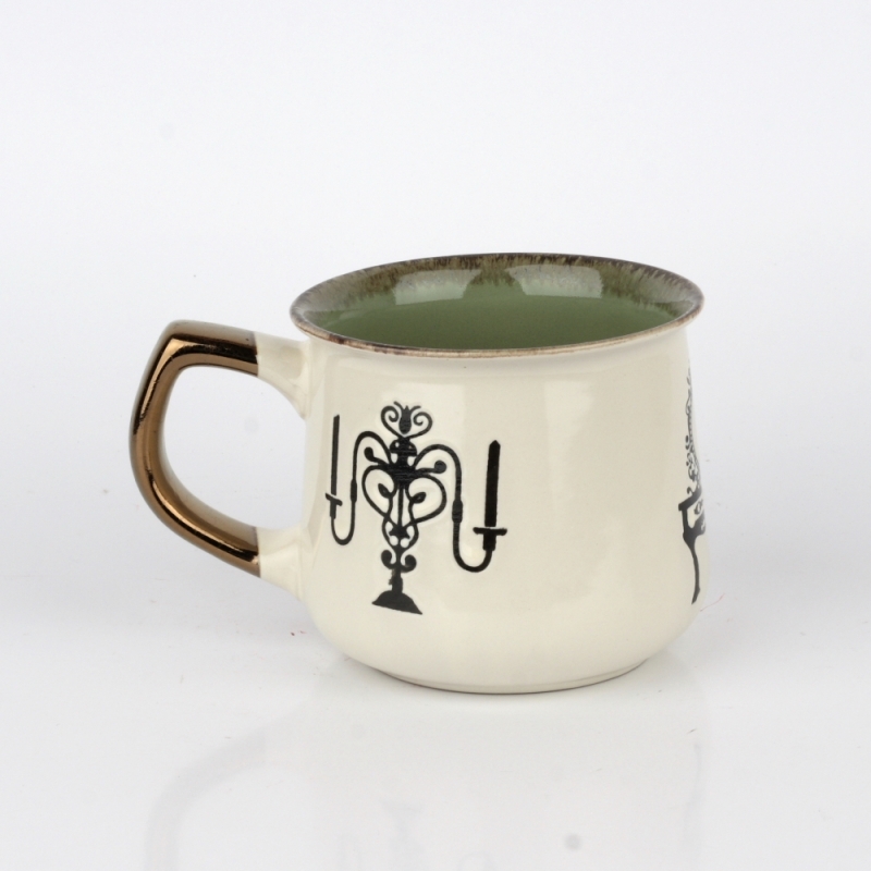 Hrnček na čaj s vintage motívmi zelený 14x10x9cm má lesklú krémovú glazúru, vnútri zelenú glazúru, bronzové ucho a prekrásne zámocké motívy.