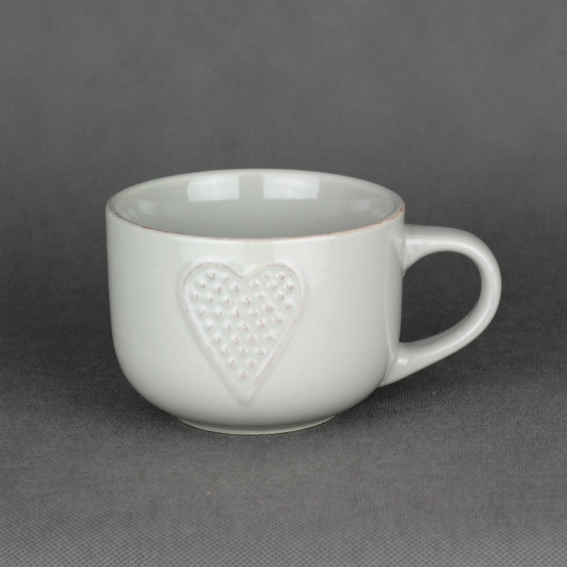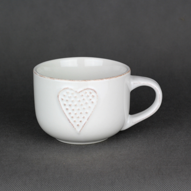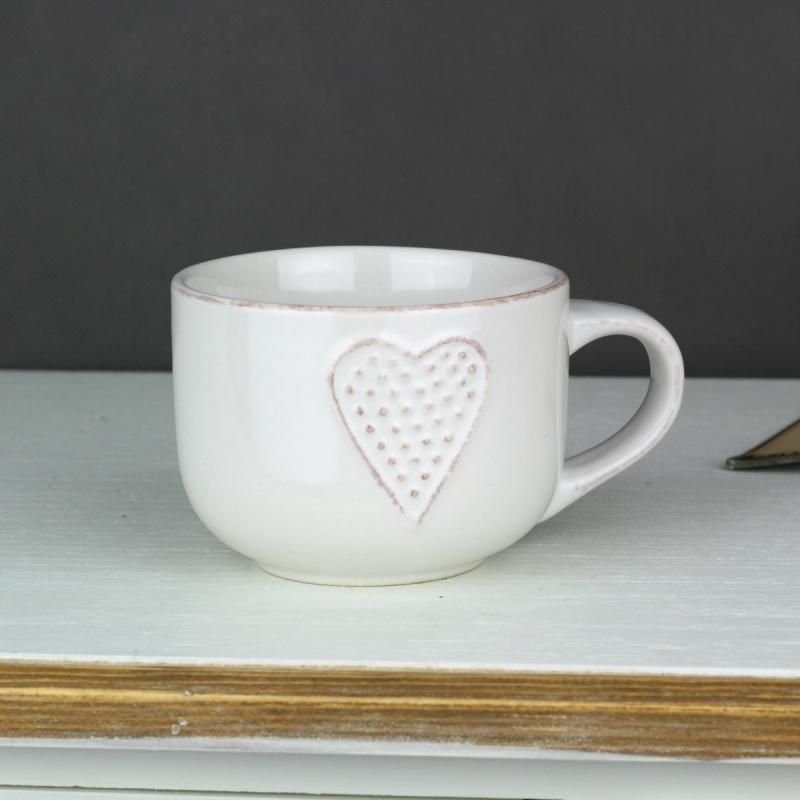 Keramický hrnček je ručne zdobený, biela lesklá glazúra je doplnená o motív srdca. V rovnakom dizajne nájdete v ponuke hrnčeky a šálky o rôznych veľkostiach a farebných variantoch.