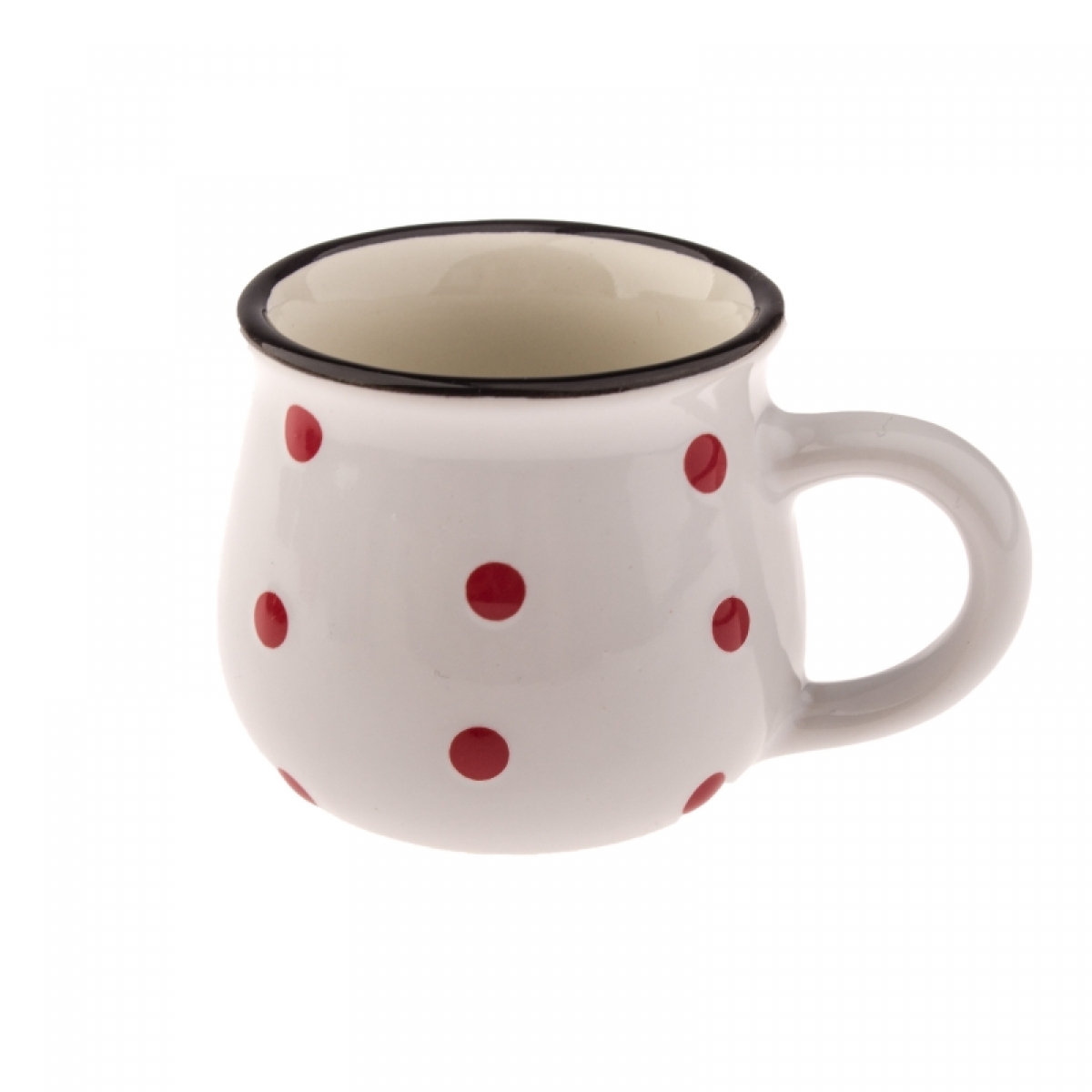 Hrnček na kávu alebo kakao v bielej farbe s červenými bodkami