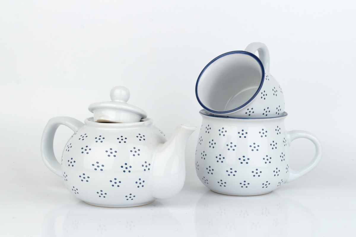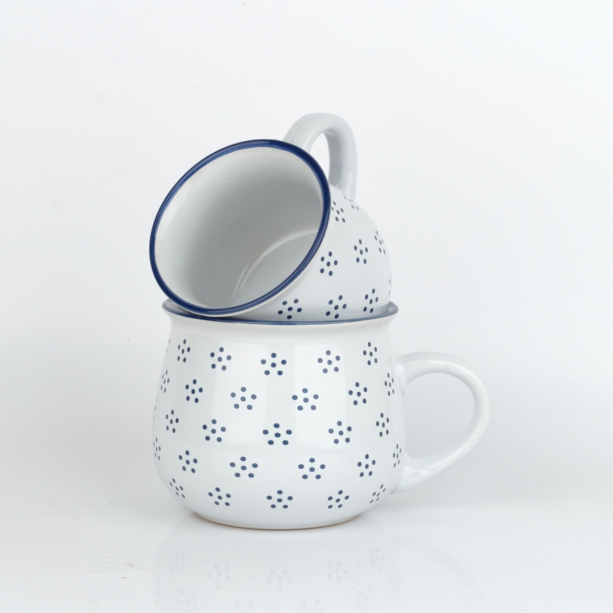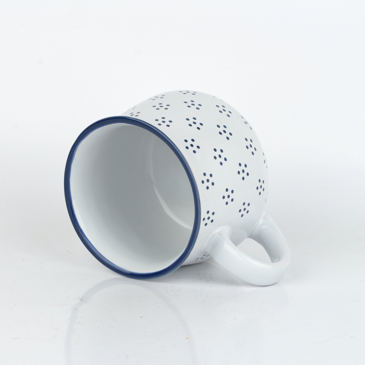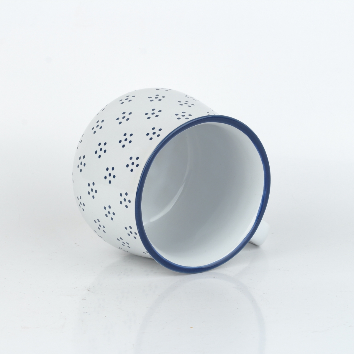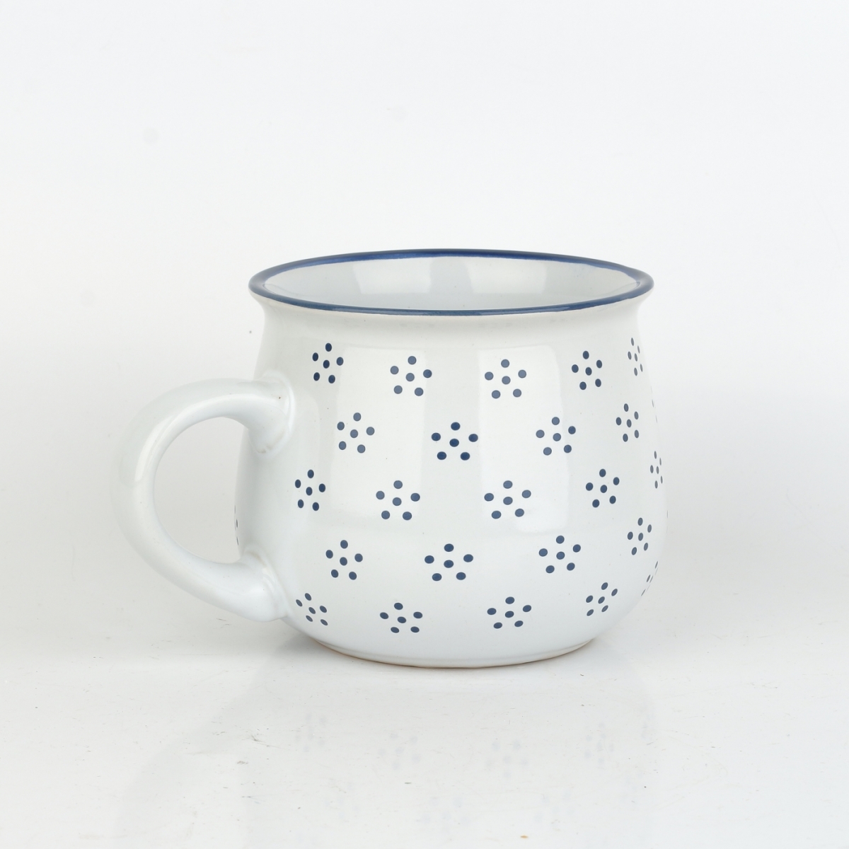 Tento hrnček má tradičný bucľatý tvar s veľkým uchom. Je ručne vyrobený z kvalitnej keramickej hliny, opatrený odolnou bielou glazúrou a zdobený drobnými čiernymi bodkami, ktoré sú usporiadané do štylizovaných kvietkov.