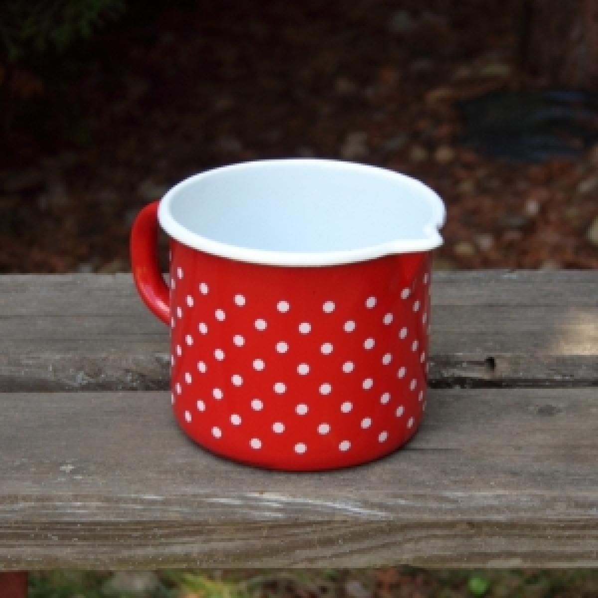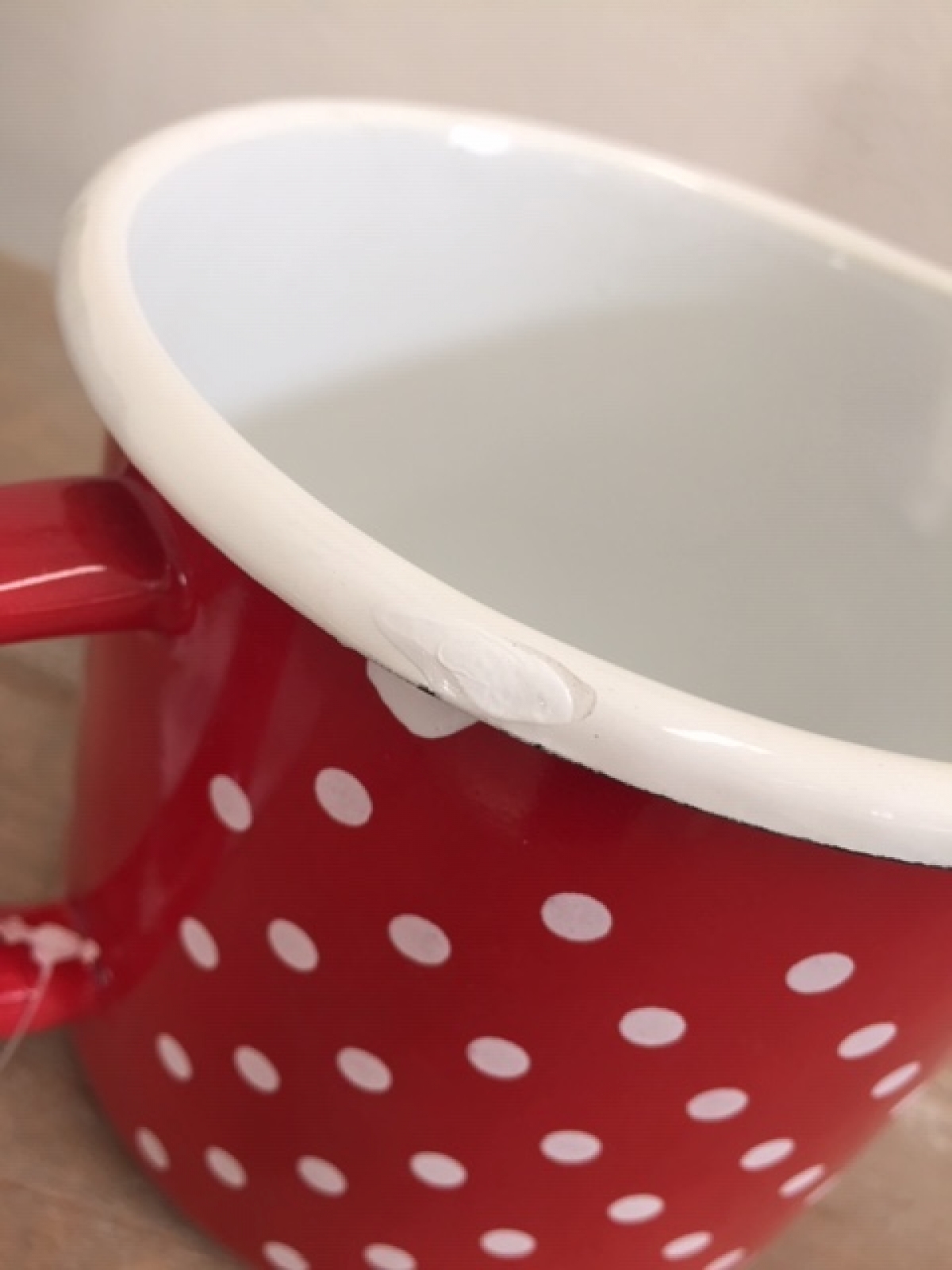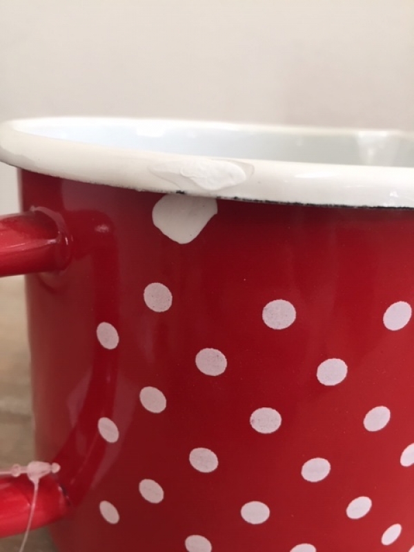 Hrnek s měrkou na vaření v červené barvě s puntíky je vyřen z důvodu poškození smaltu. Poškození je opravené bílou barvou (foto č. 3 a 4).