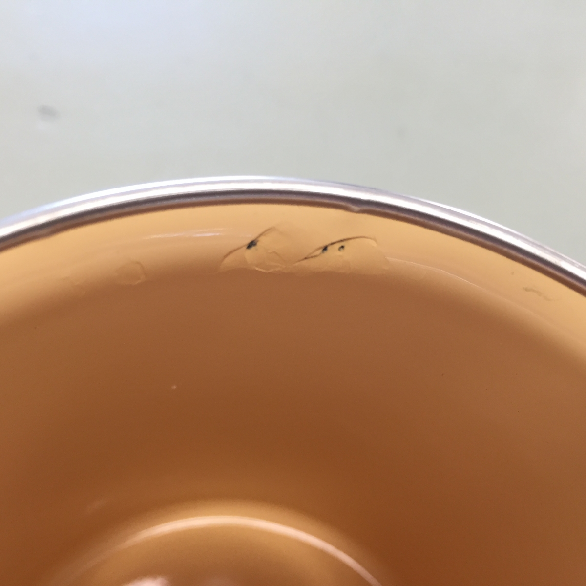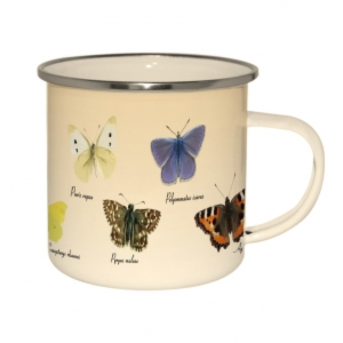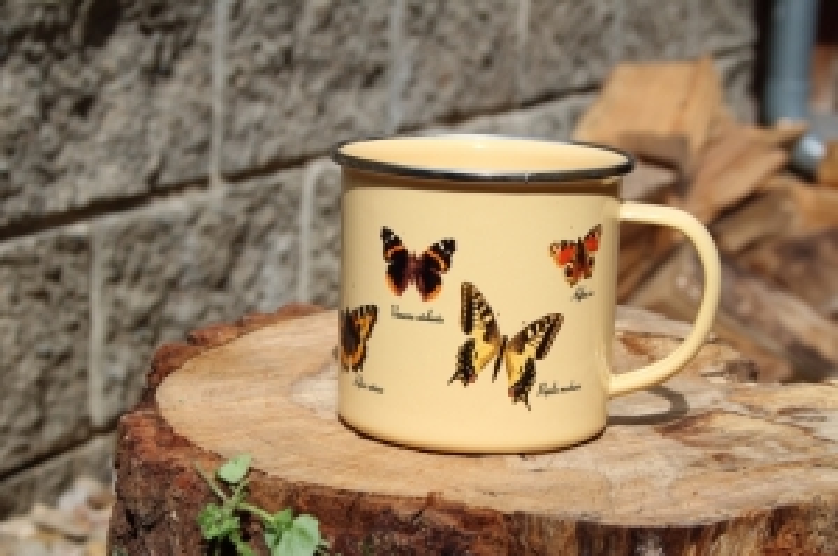 Hrnek smalt se vzory motýlků je vyřazený z důvodu poškození smaltu.