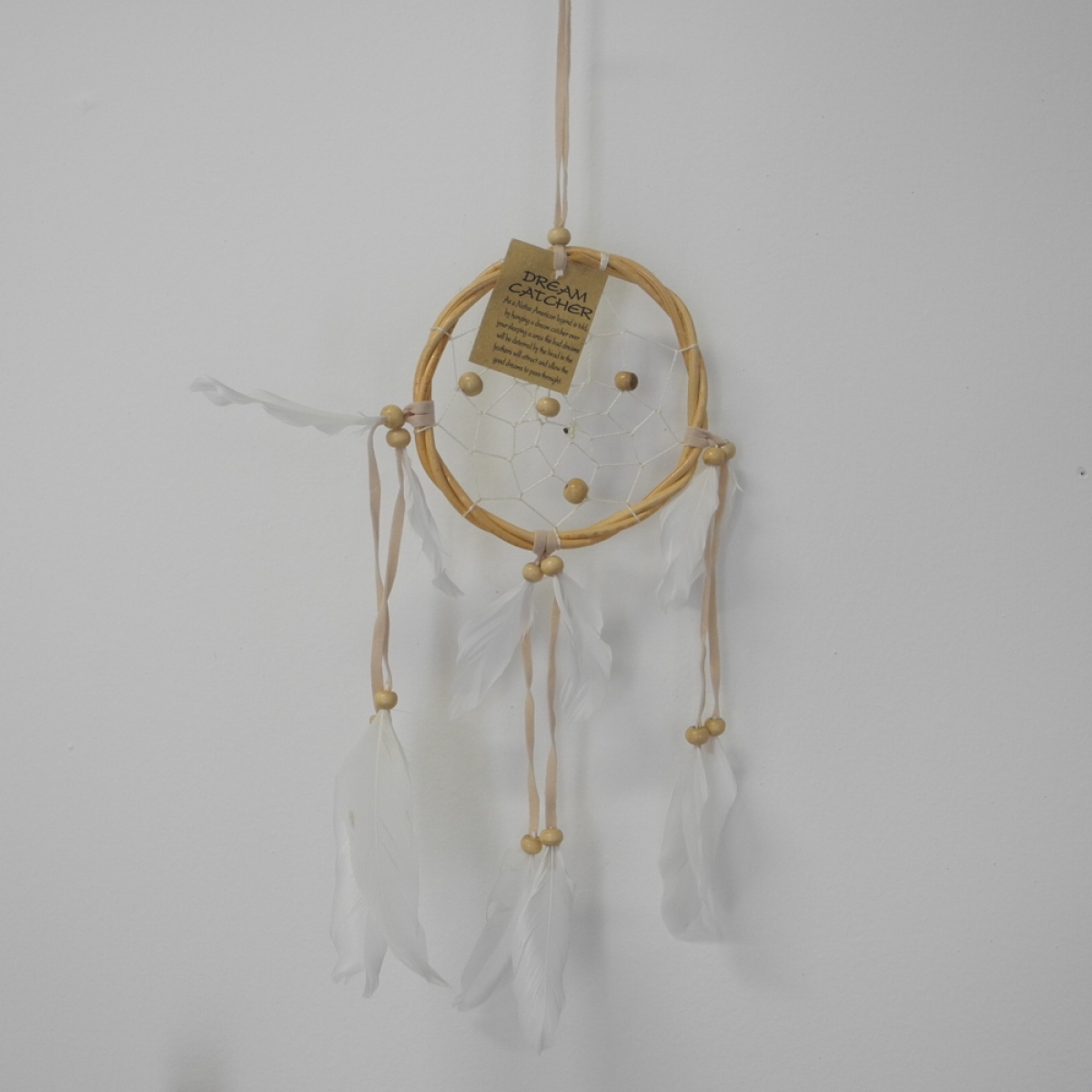 Indiánsky lapač snov s ratanovým kruhel o priemere 12,5cm a celkovú výškou 45cm.