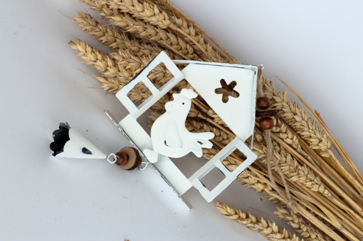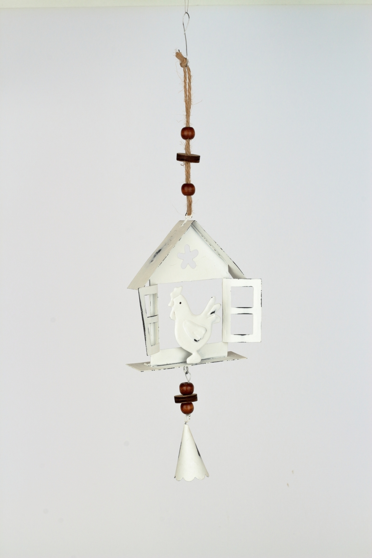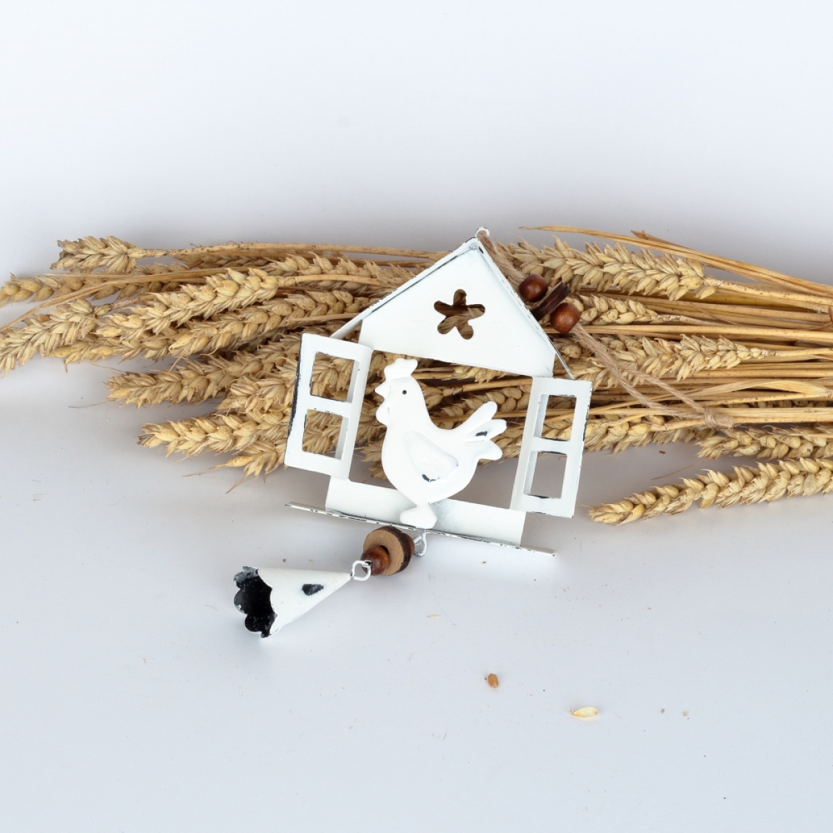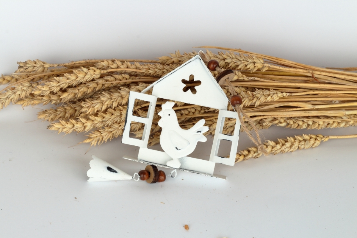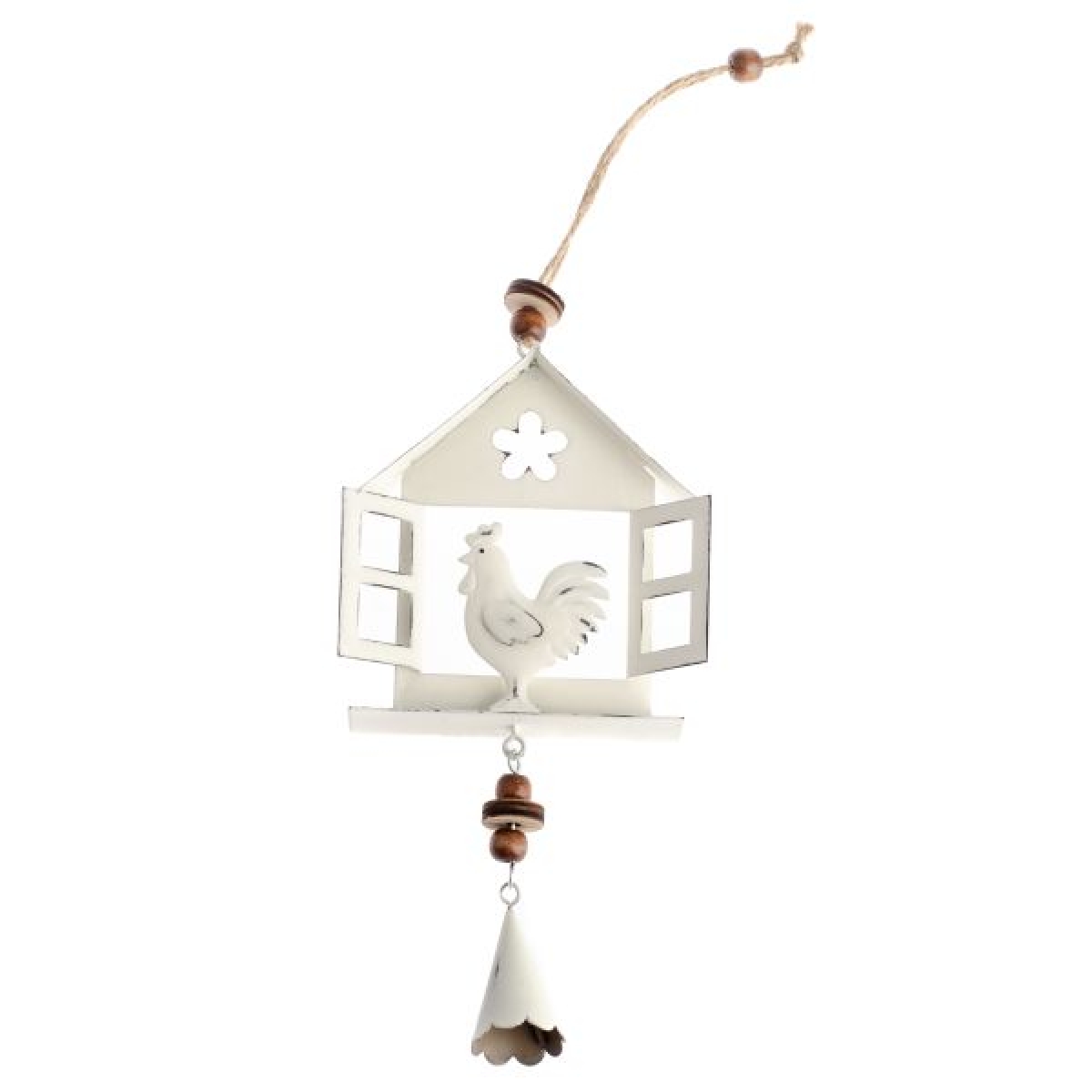 Jarná závesná dekorácia domček s kohútom 10x32x3cm do okna aj na vchodové dvere.