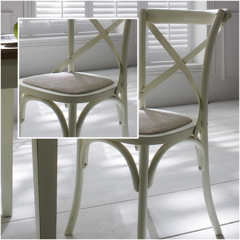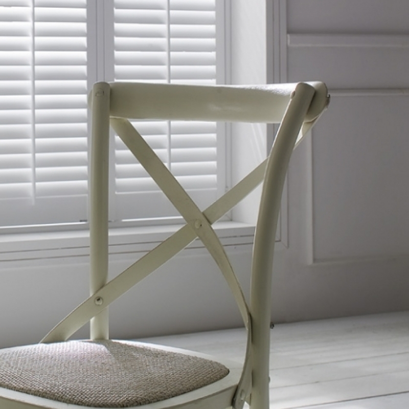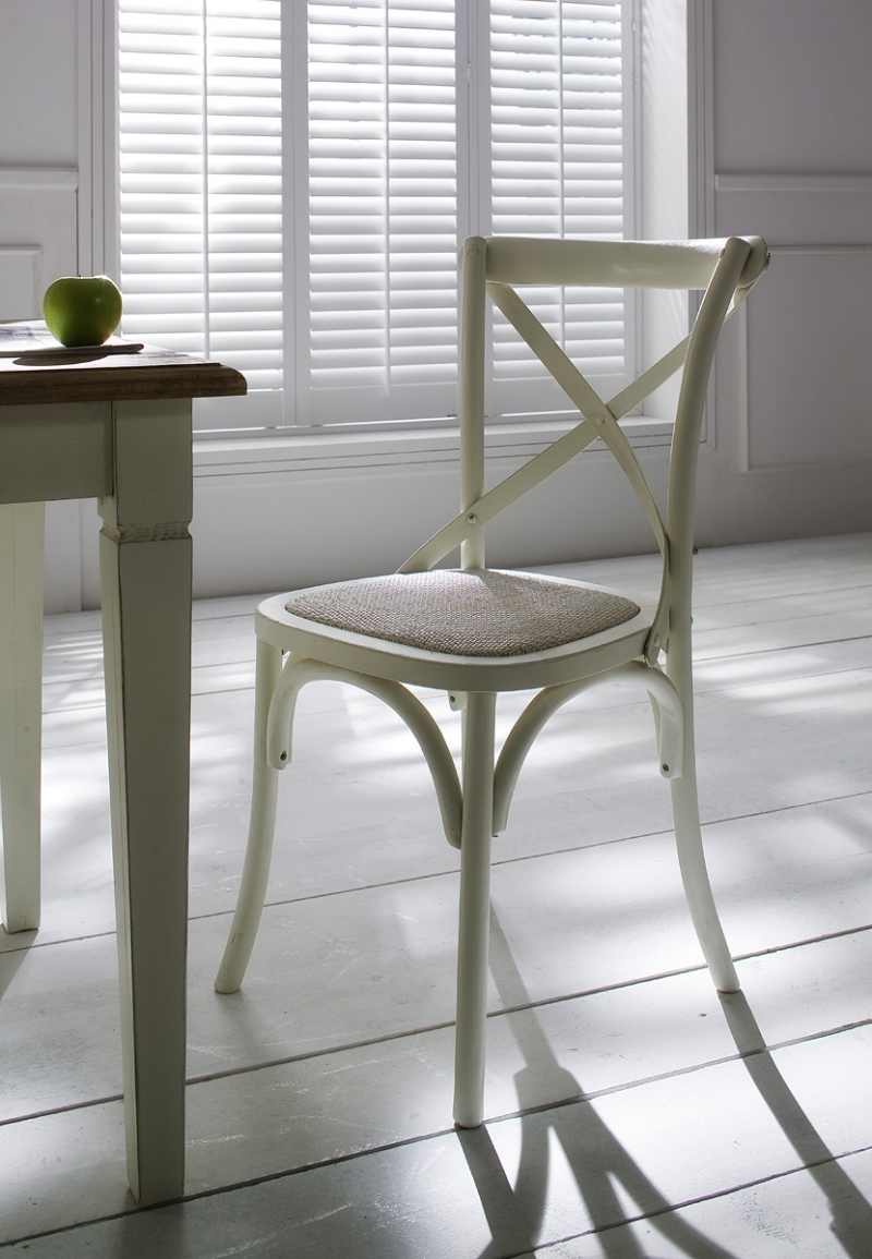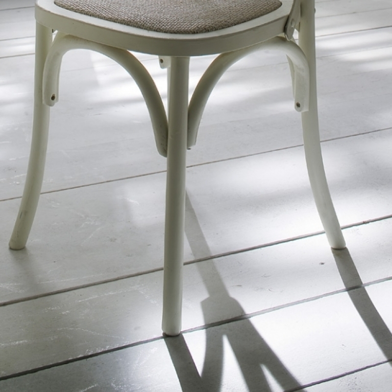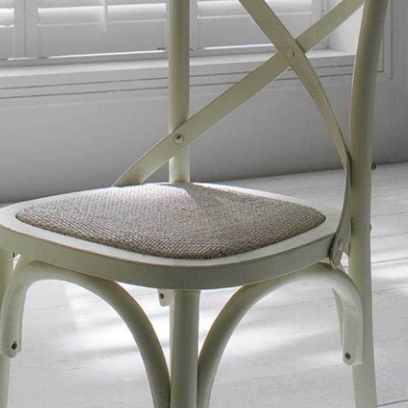 Stolička má vyplietaný sedák v prírodnej ražnej farbe , drevené časti stoličky sú biele .