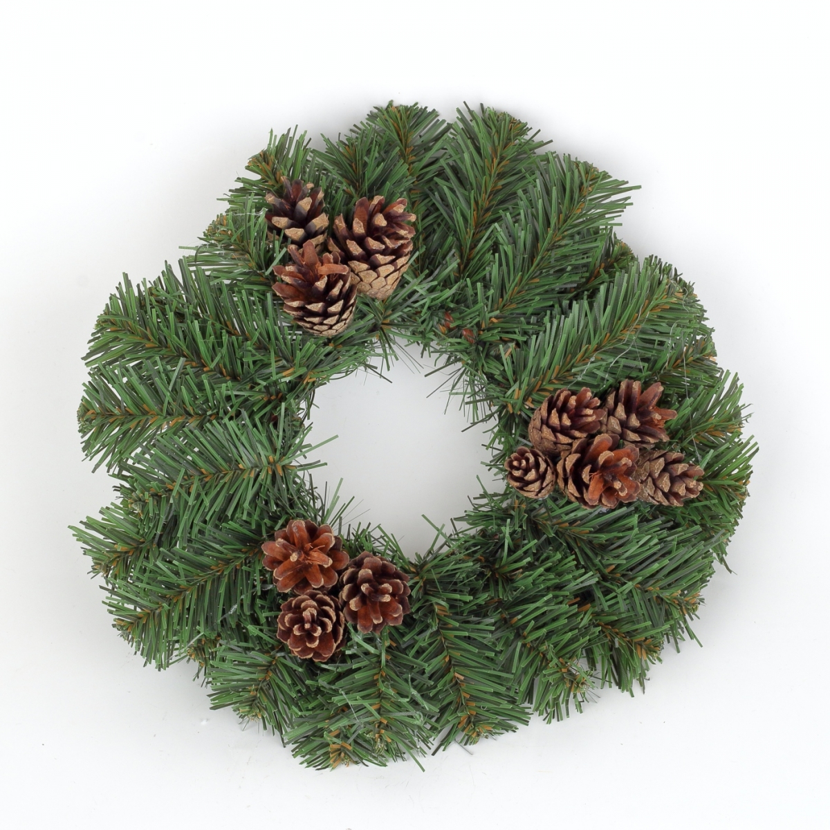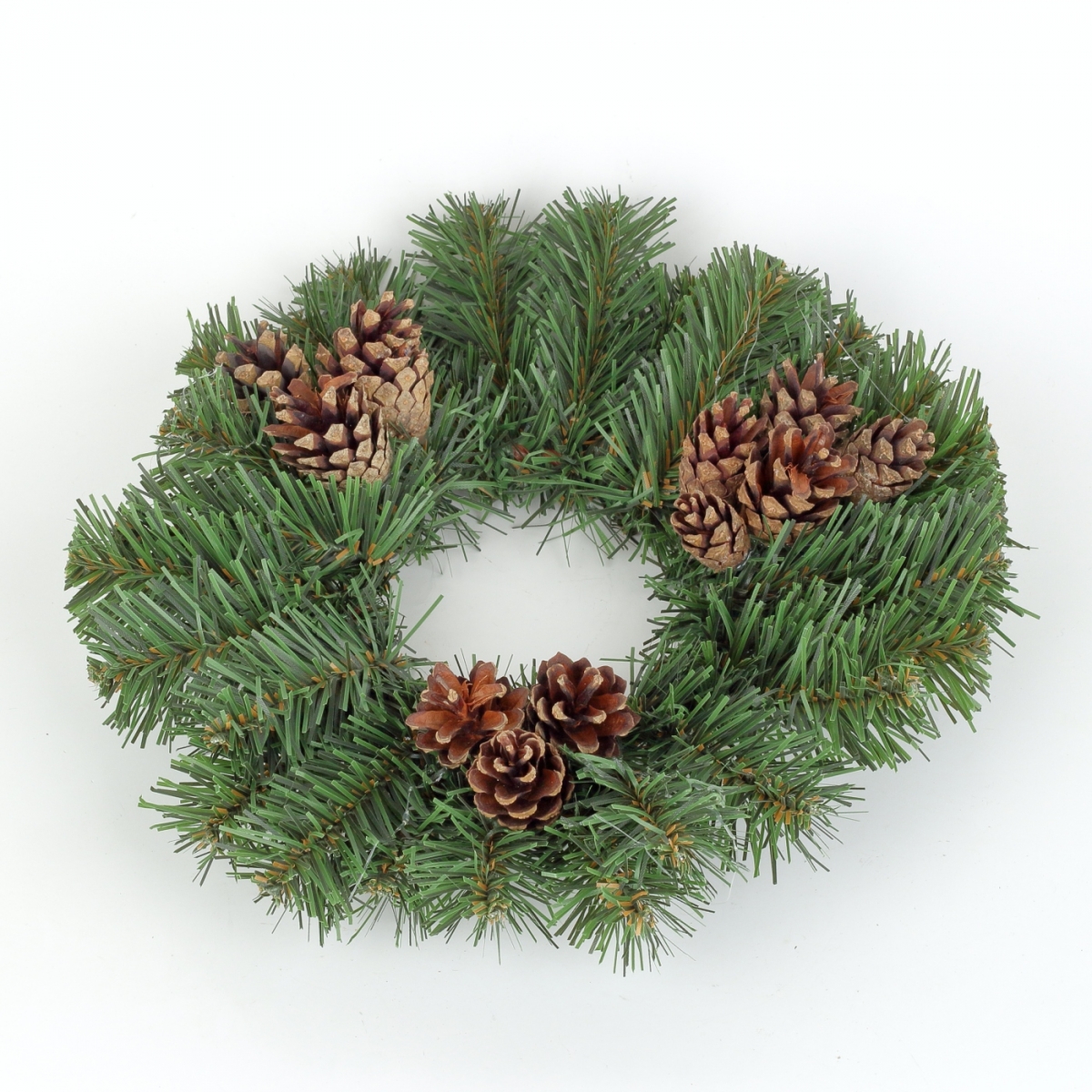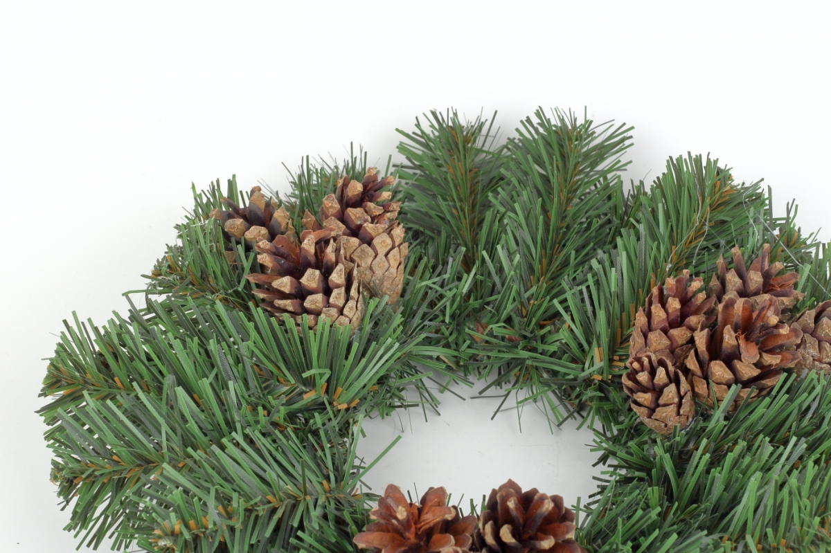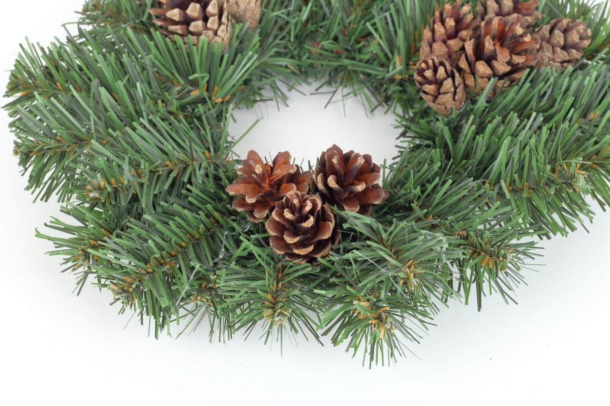 Jesenný veniec z umelých borovicových vetvičiek so šiškami.