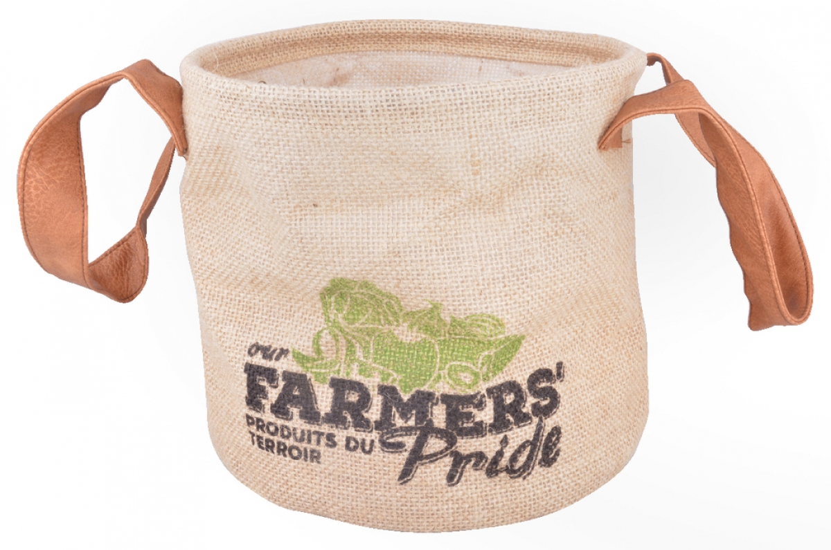 Jutová taška je vybavená dvoma postrannými úchopy. Môžete ju použiť ako obal na bylinky či rastliny v kvetináči, pretože na dne sa nachádza odtokové otvory. Taška má farebnou potlač s motívom zeleniny a nápisom FARMERS Pride.