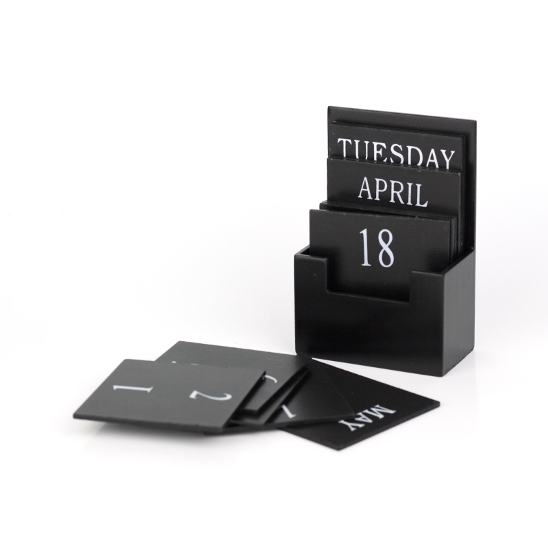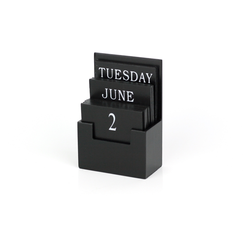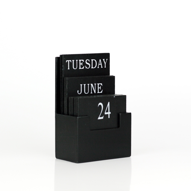Tento štýlový kalendár funguje na princípe "kartičiek", ktoré ukazujú koľký deň v mesiaci práve je, daný mesiac a deň v týždni. Kartičky sú umiestnené do drevenej priehradky, ktorá nezaberie veľa miesta, ale účelne poslúži. Text je písaný anglicky.