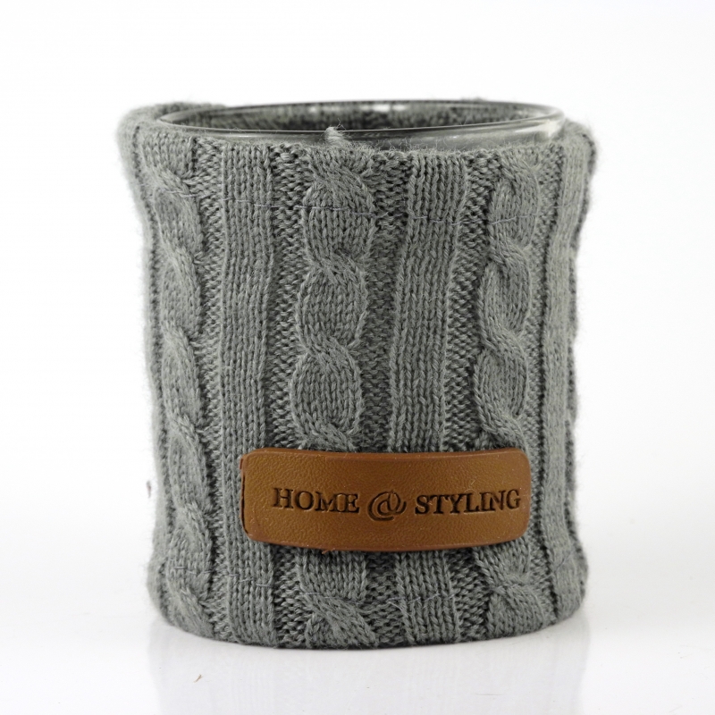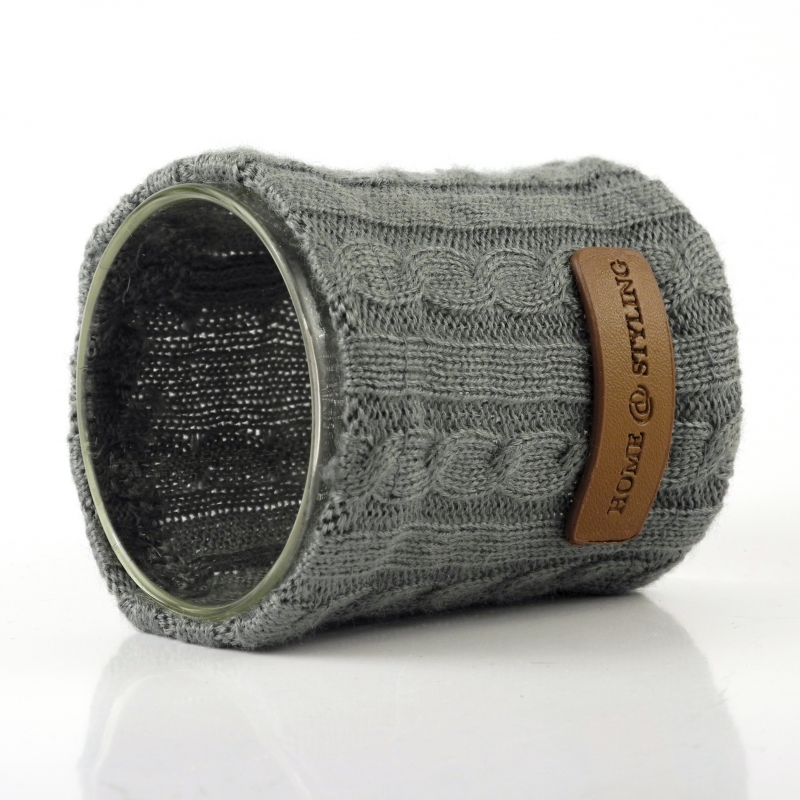 Průměr skla 7cm a výšce 8.5cm. Pletený návlek lze čisti běžným způsobem pro textílie a pletené materiály. Koženou ozdobu HOME STYLING čistěte pouze suchým hadříkem.