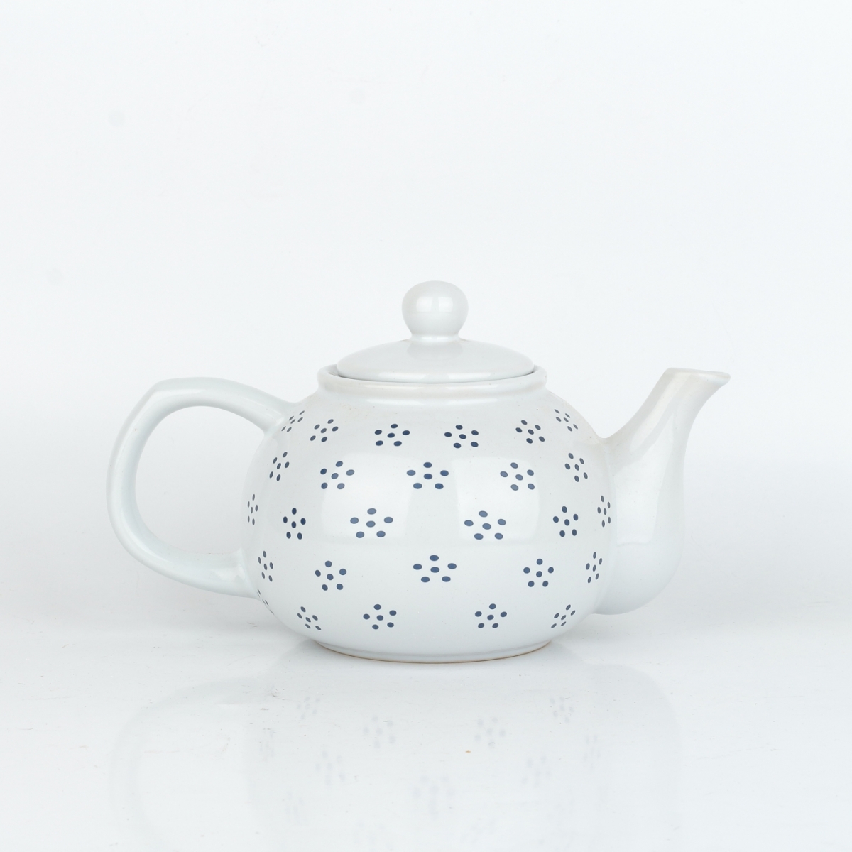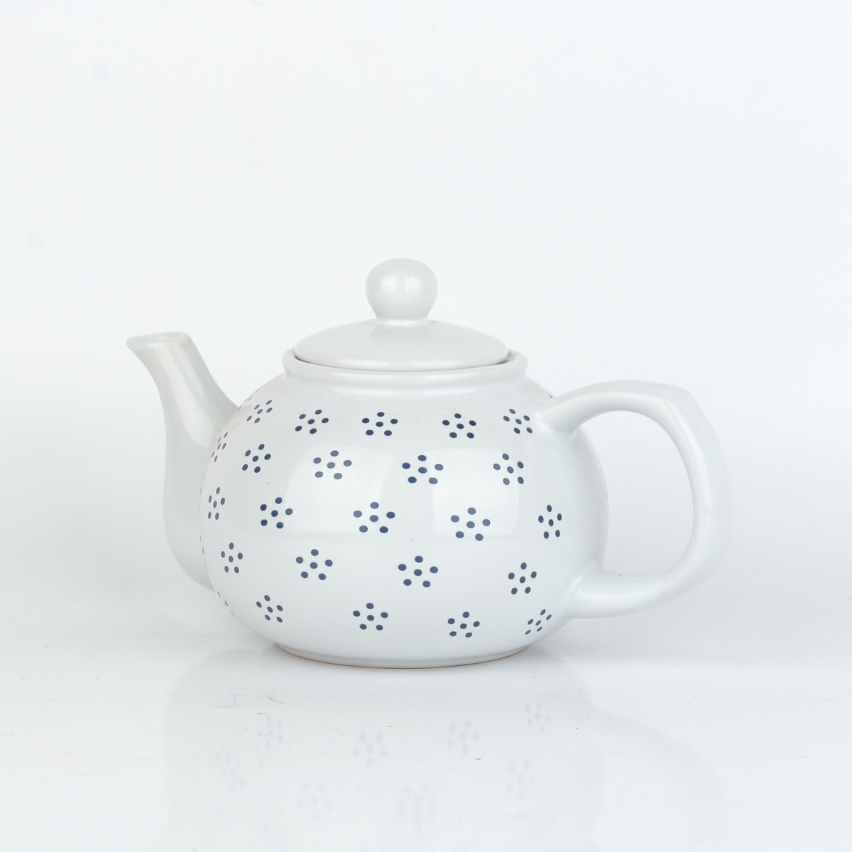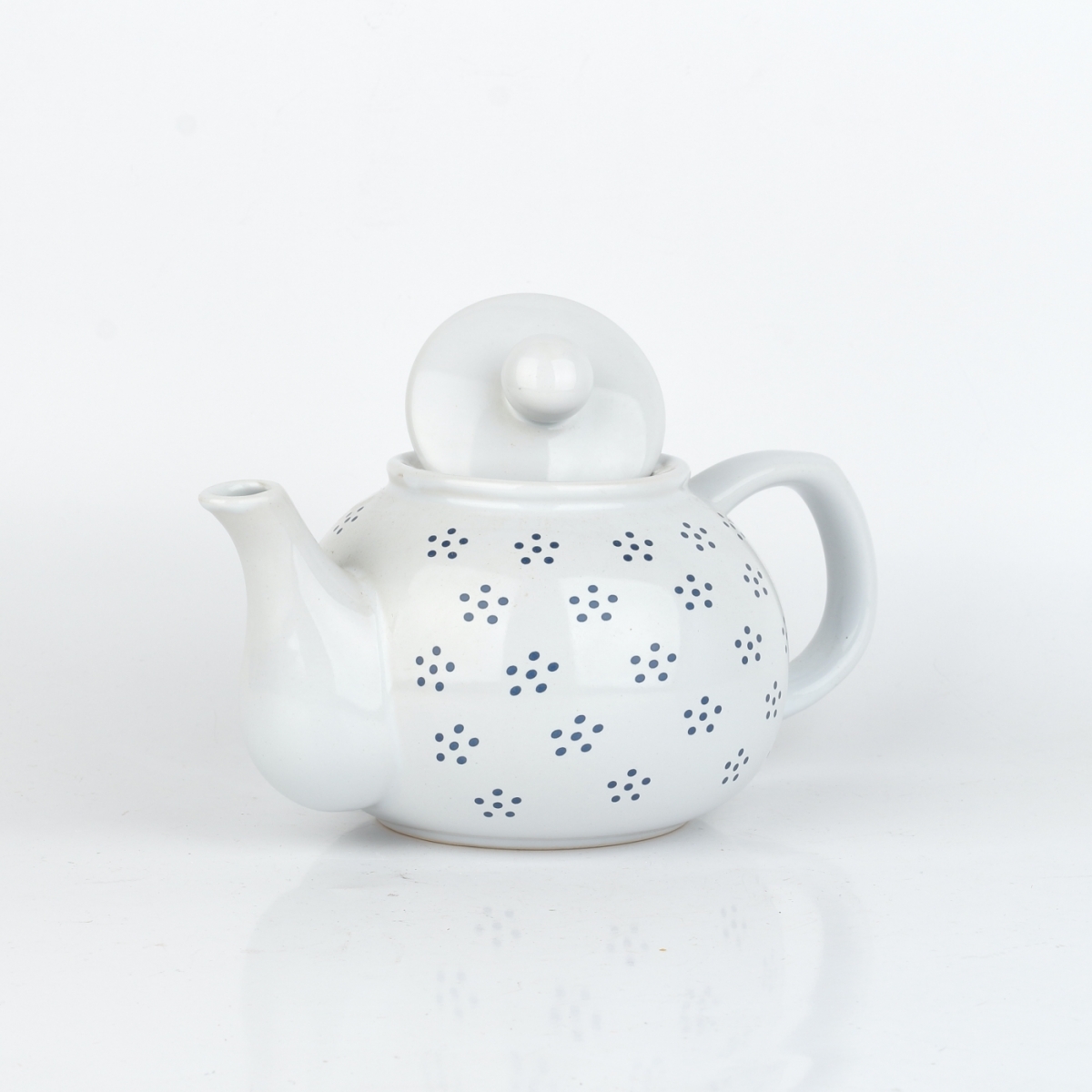 Kanvička na čaj, v bielej farbe s jemným, čiernym vzorom, urobí radosť každému milovníkovi tohto nápoja. Má tradičný bucľatý tvar, veľké ucho, vďaka ktorému sa ľahko prenáša, a pokrievku, aby jej obsah zostal dlhšie teplý.