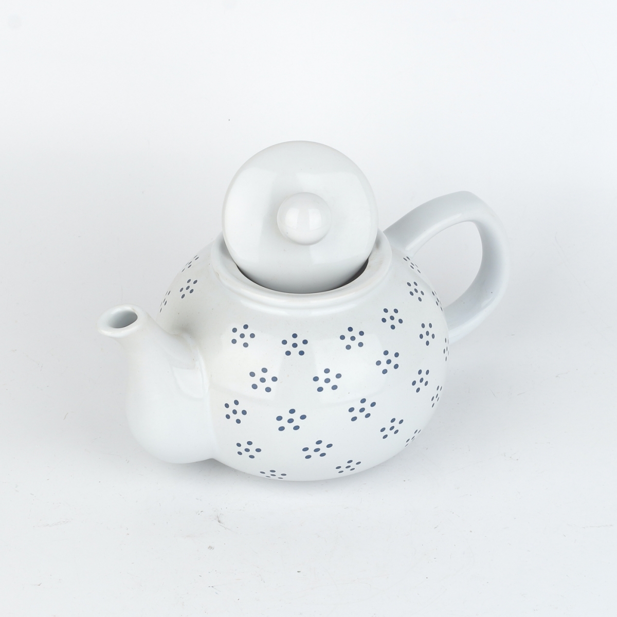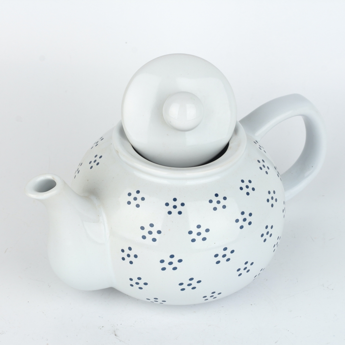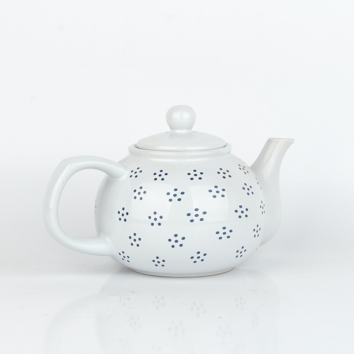 Kanvička na čaj, v bielej farbe s jemným, čiernym vzorom, urobí radosť každému milovníkovi tohto nápoja. Má tradičný bucľatý tvar, veľké ucho, vďaka ktorému sa ľahko prenáša, a pokrievku, aby jej obsah zostal dlhšie teplý.