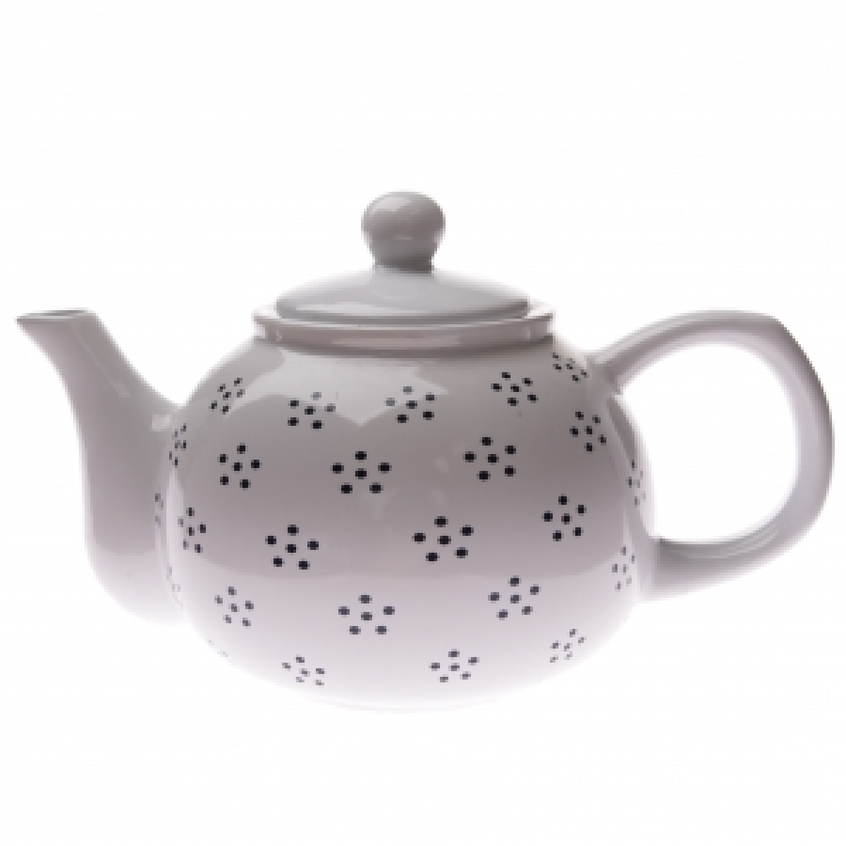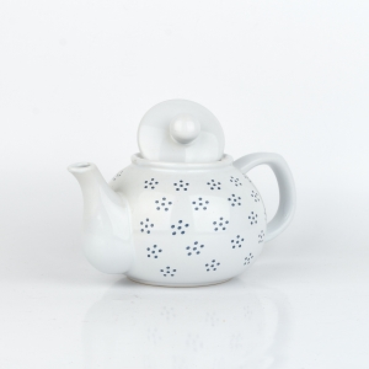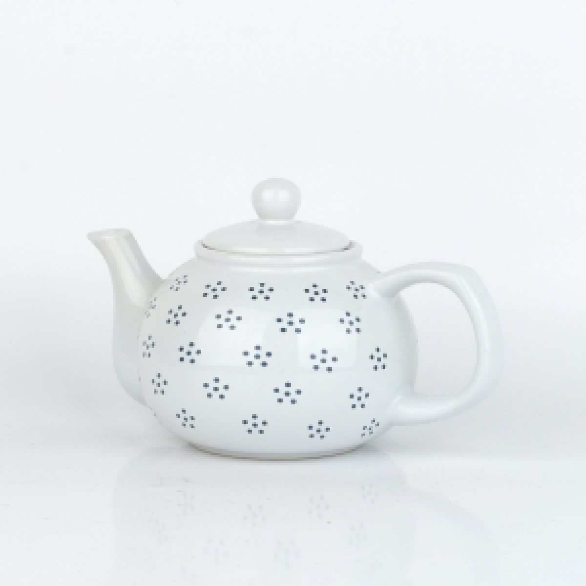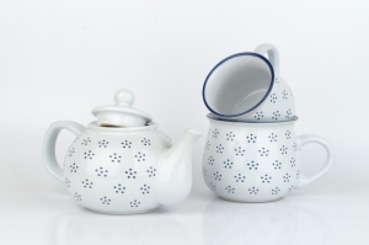 V našej ponuke nájdete k tejto kanvičke aj rôzne veľké hrnčeky s rovnakým vzorom, teda malými štylizovanými modrými kvietkami, ktoré sú vytvorené zo šiestich bodiek. Táto keramika je nielen praktická, ale aj oku lahodiaca, bude tak pekným doplnkom vo vašej kuchyni.