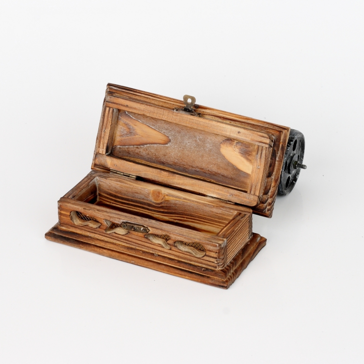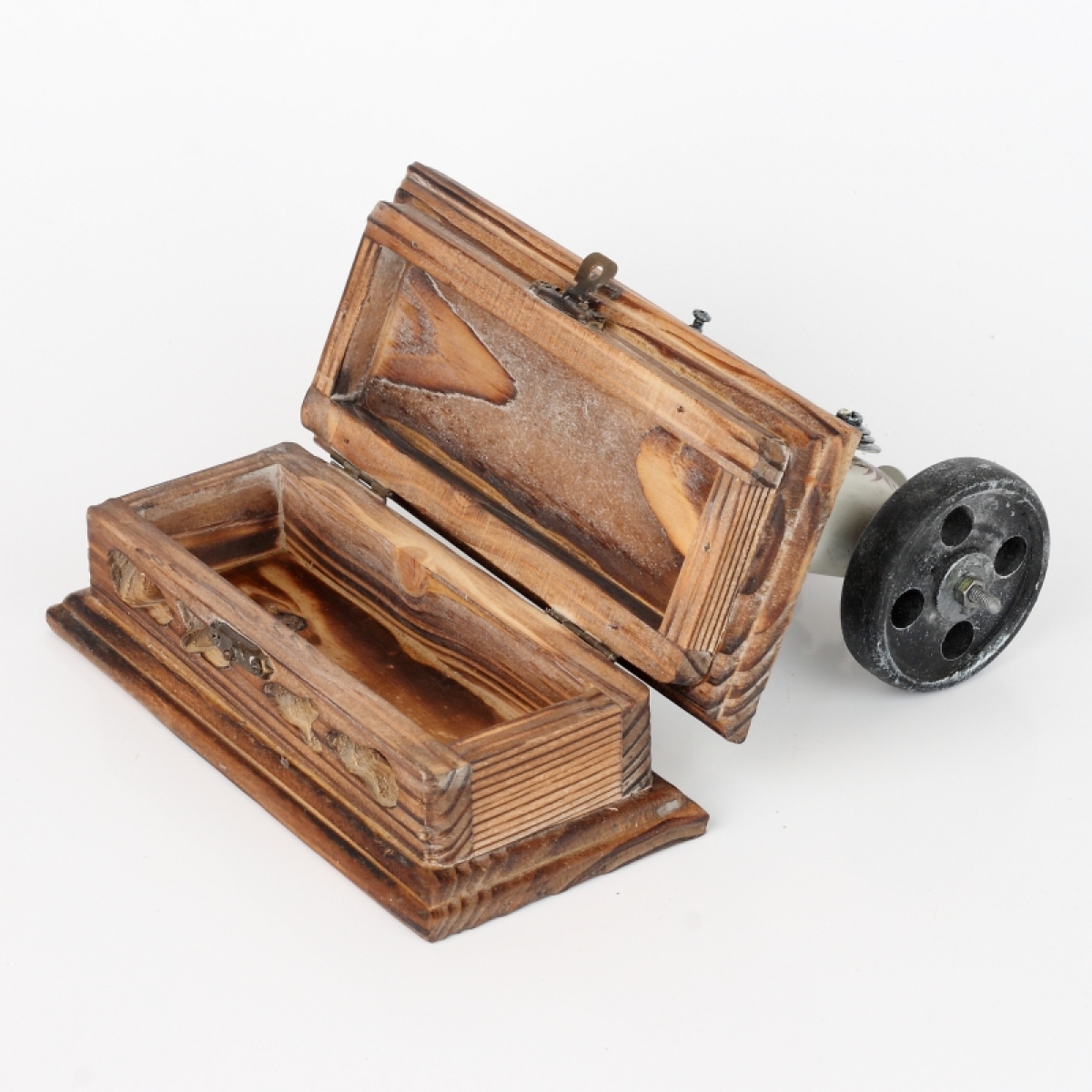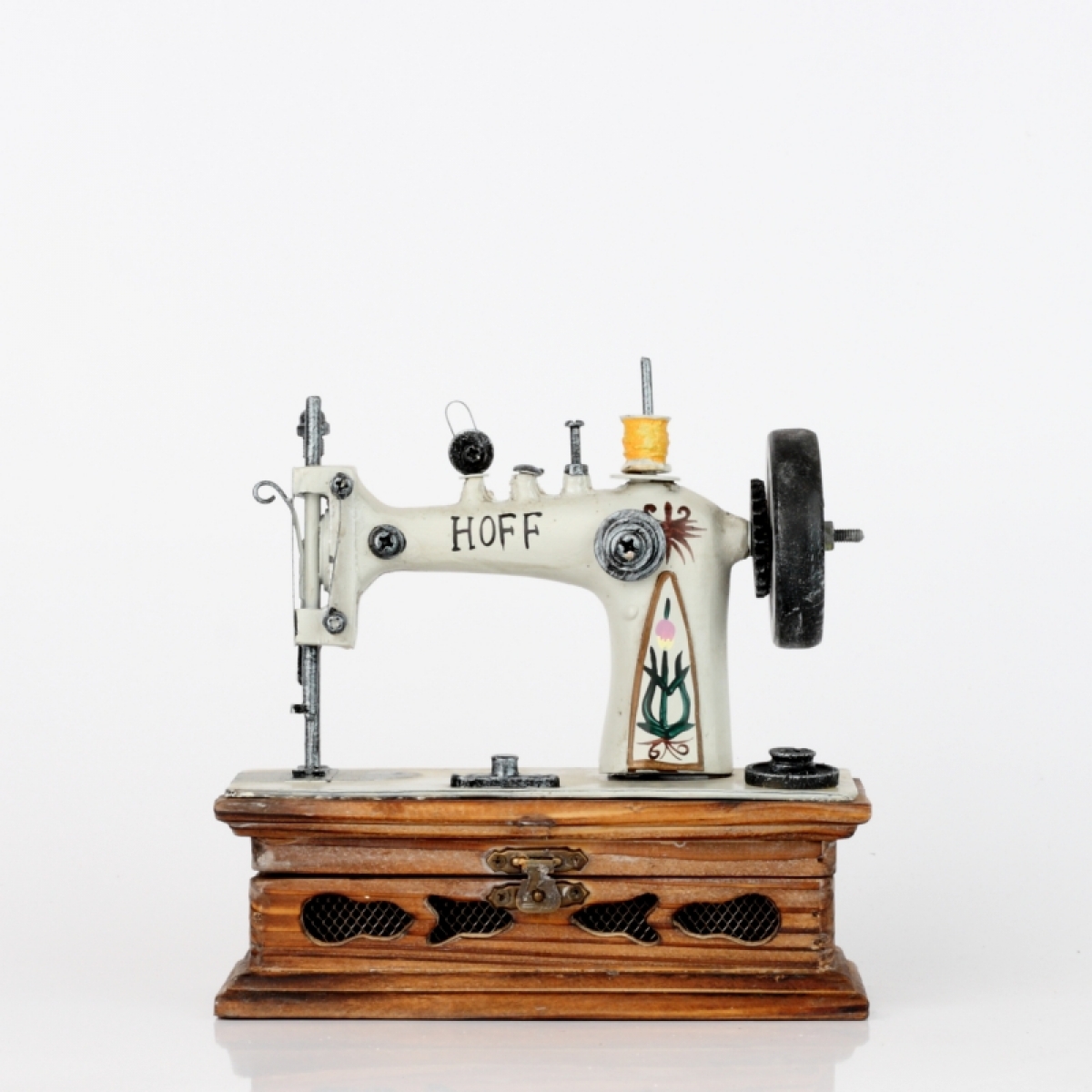 Drevěná kazeta na šitie s krásnym detailno prepracovaným modelom šijacého stroja.