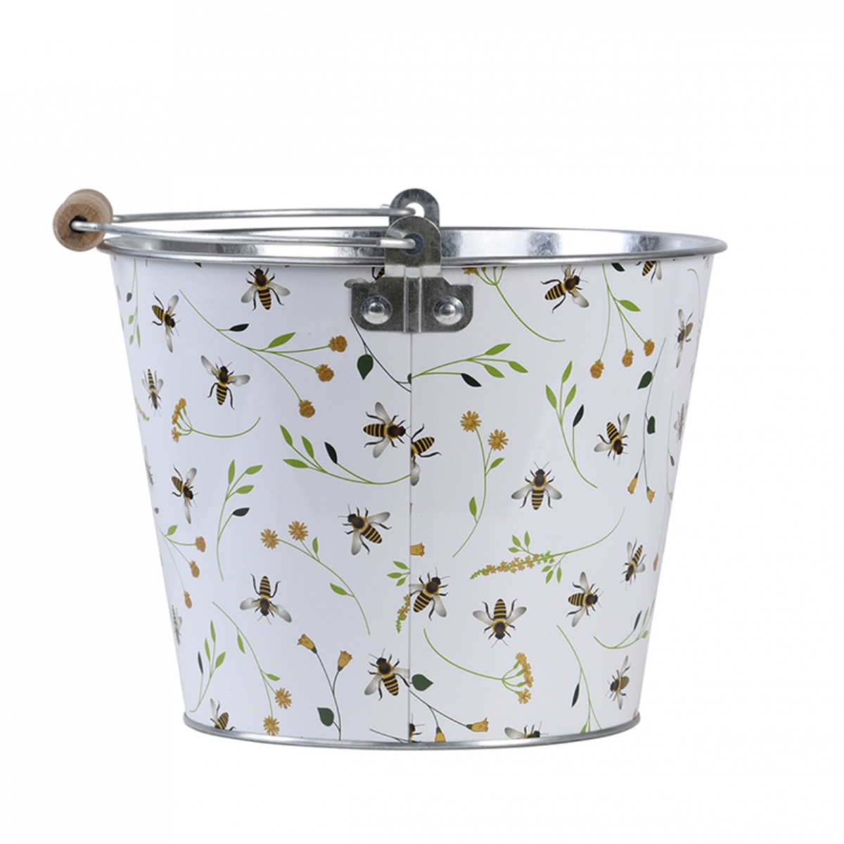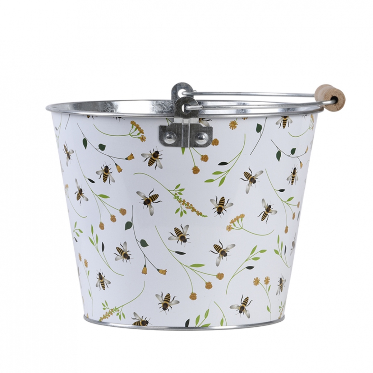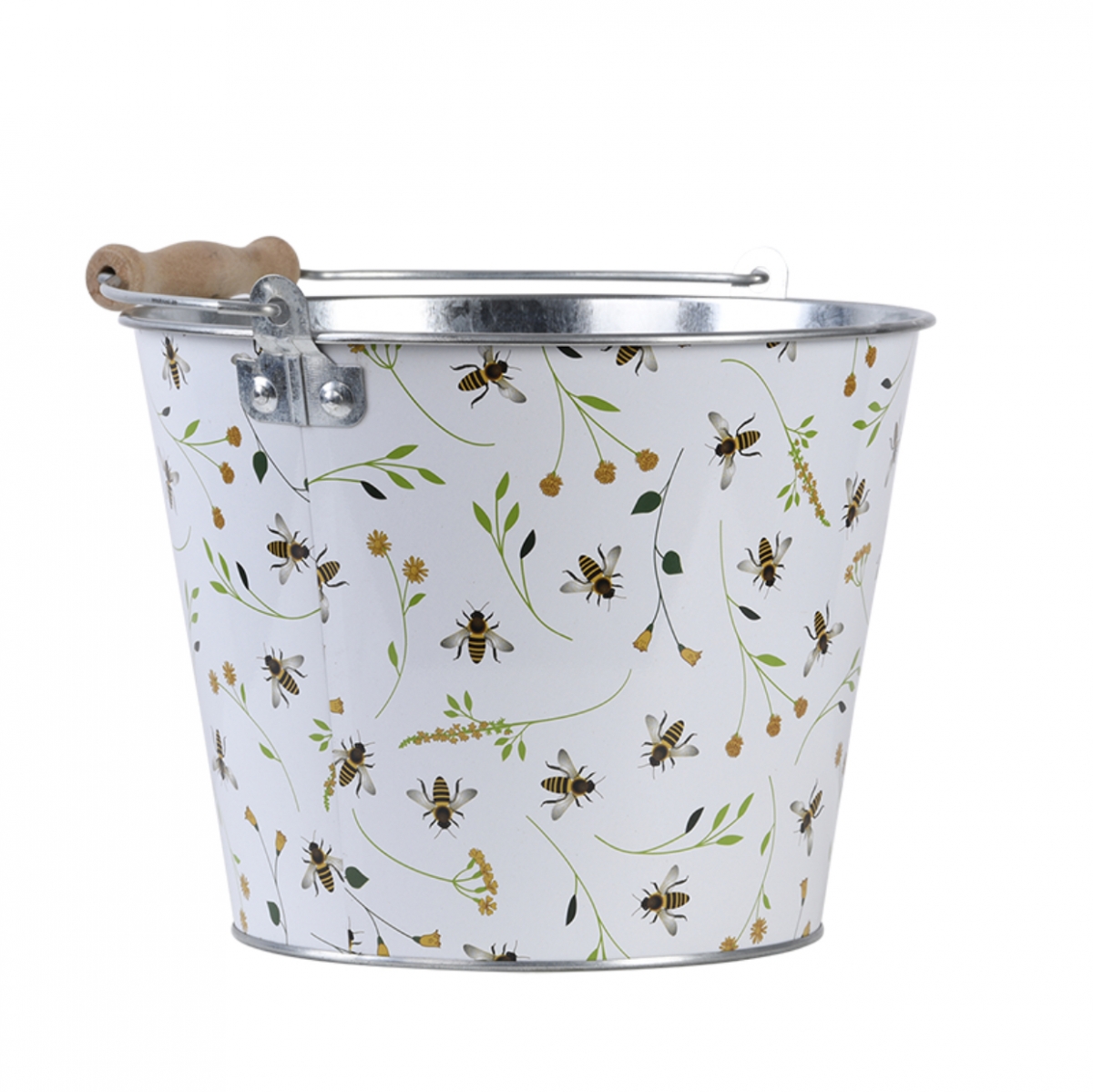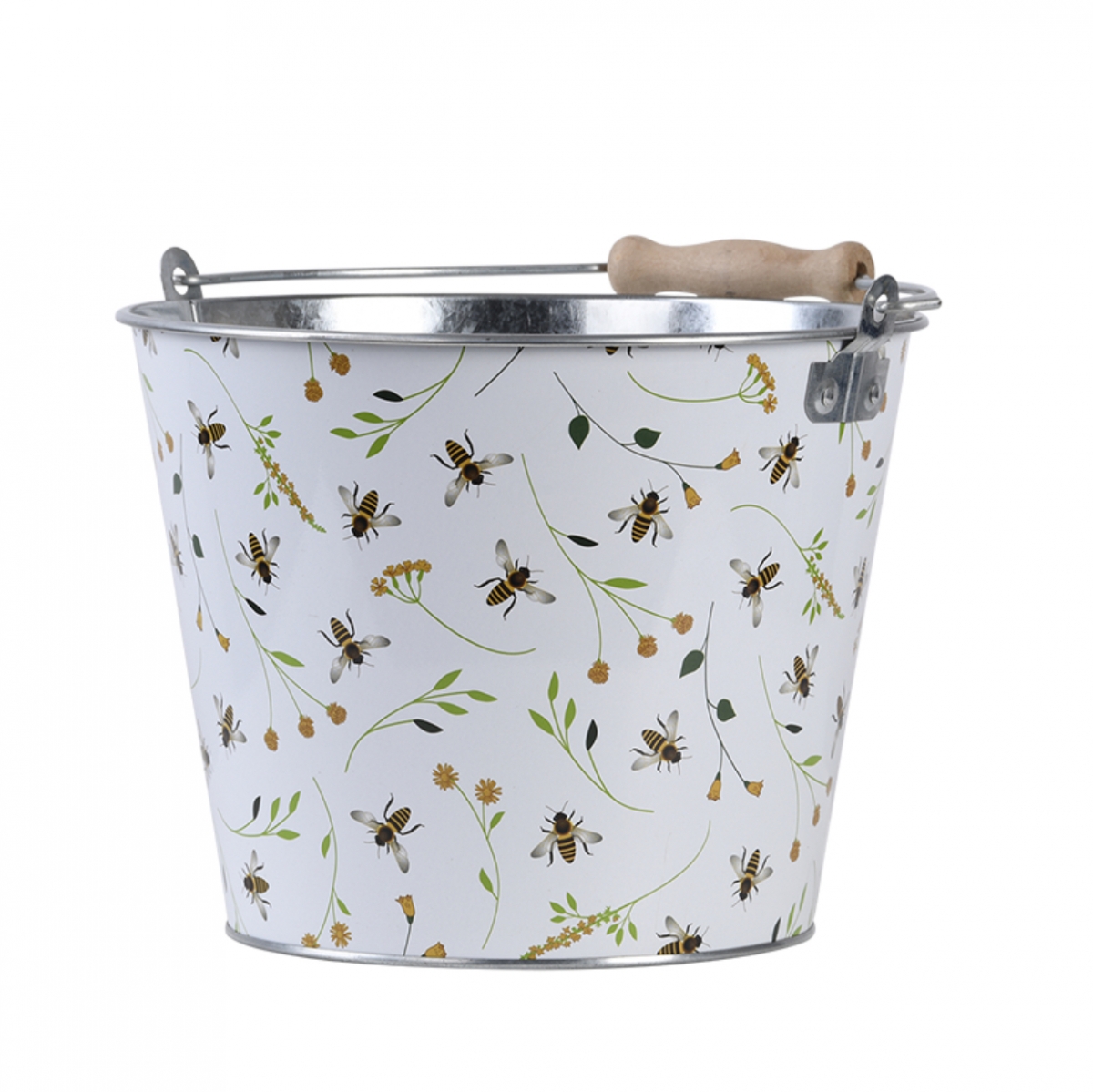 Vedro s rukoväťou pre jednoduché prenášanie. Vedro možno použiť len na dekorační účely, alebo ako štýlový obal na kvetináč, s nádherným včelím potlačou. Nádherný včelí potlač.
