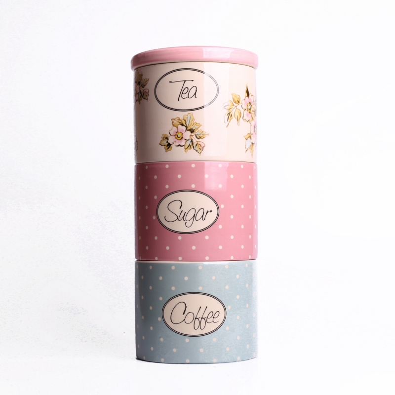 Keramická dóza na kávu / čaj / cukor 29,5x13cm Vás donúti vyhádzať nevzhľadné papierové vrecká a premiestniť suroviny do týchto krásnych dózičiek. Rozhodne si zaslúži čestné miesto na pracovnej doske v kuchyni, pretože má nádhernú glazúru v pastelových farbách ružovej a blankytne modrej farby s bodkami a jednu neutrálne krémovou dózu s motívom kvetín Proste rozprávková kombinácie, čo myslíte.