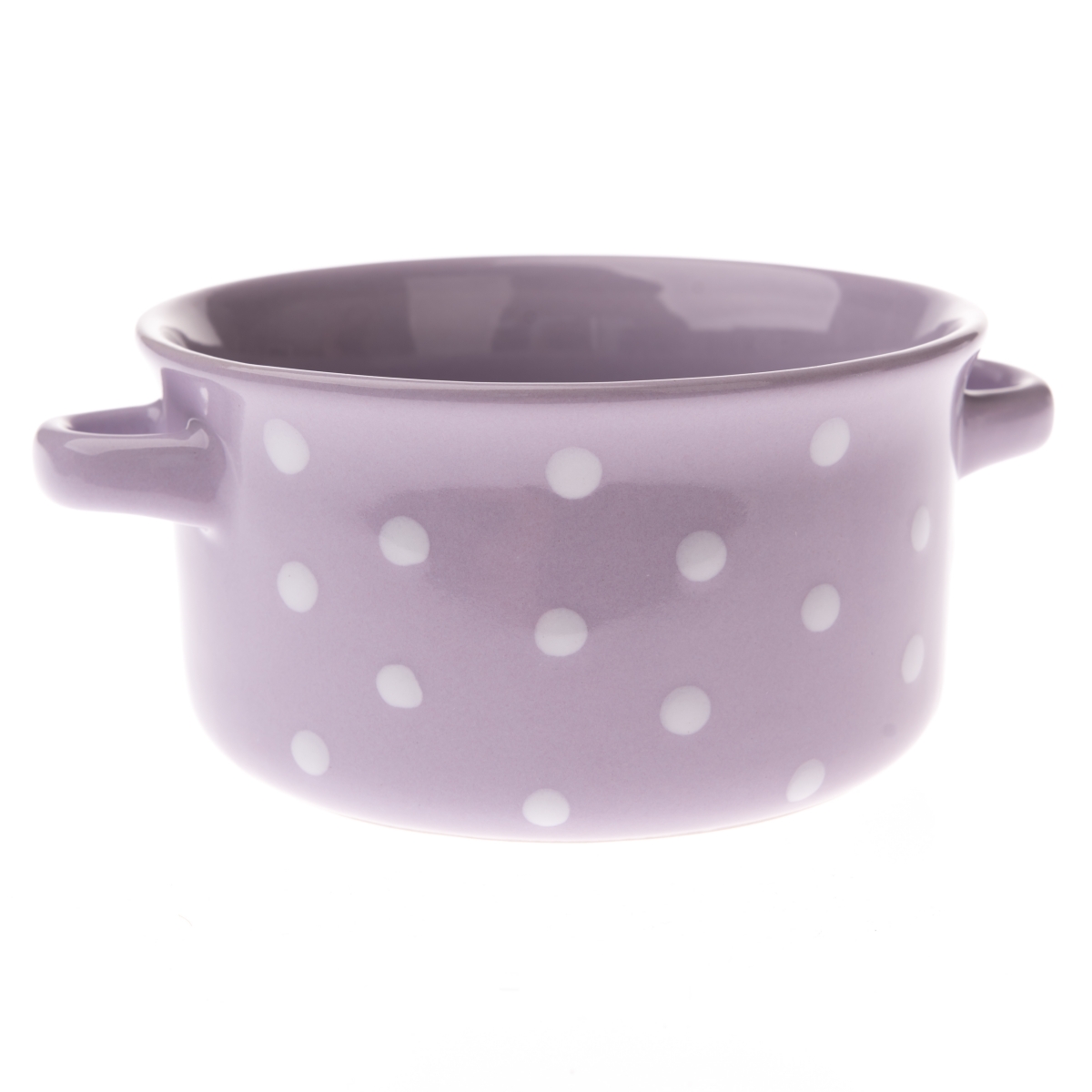 Keramická miska vytvorí zaujímavý farebný akcent na vašej prestretej tabuli, vďaka nežnej fialovej glazúre s hravými bielymi bodkami.