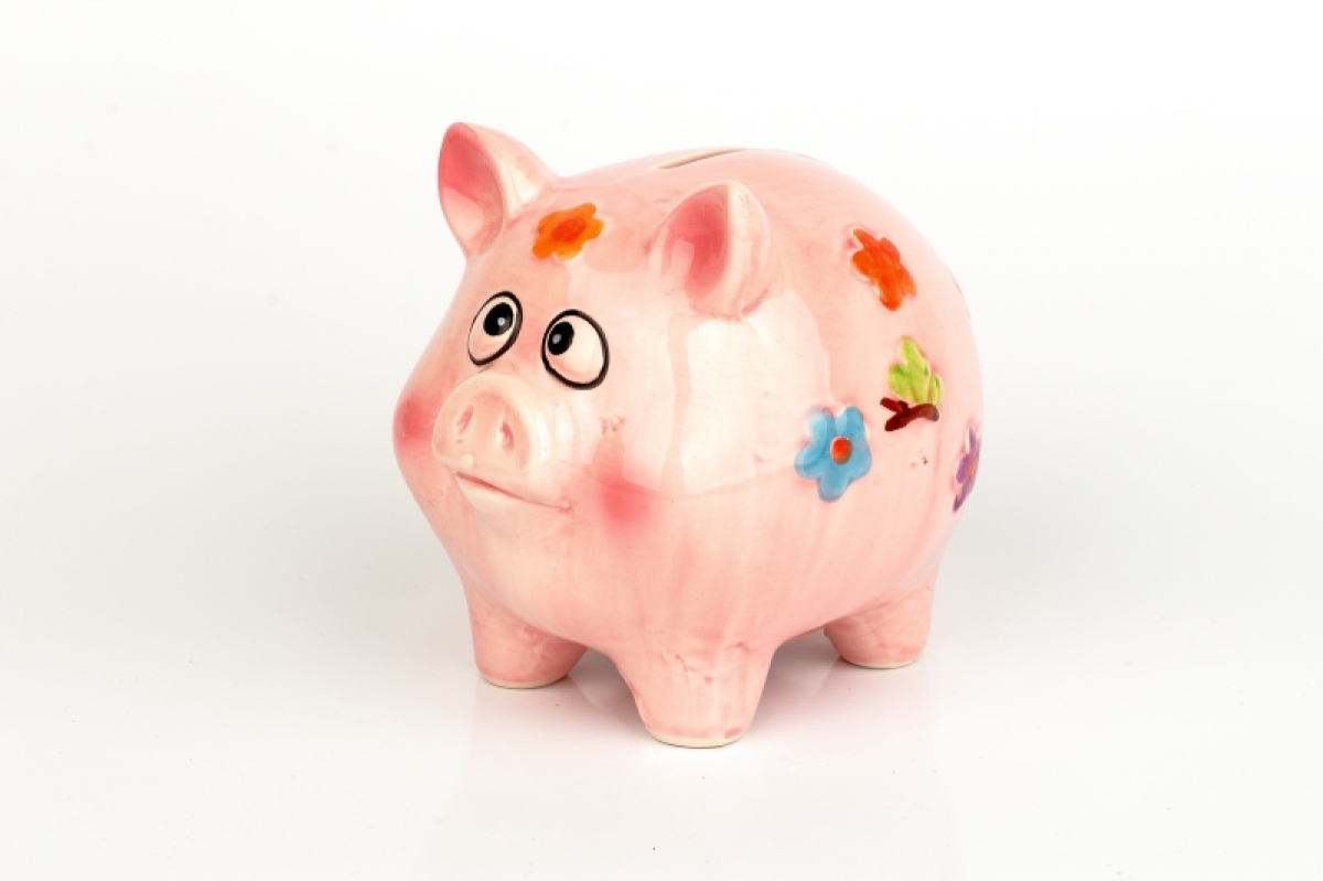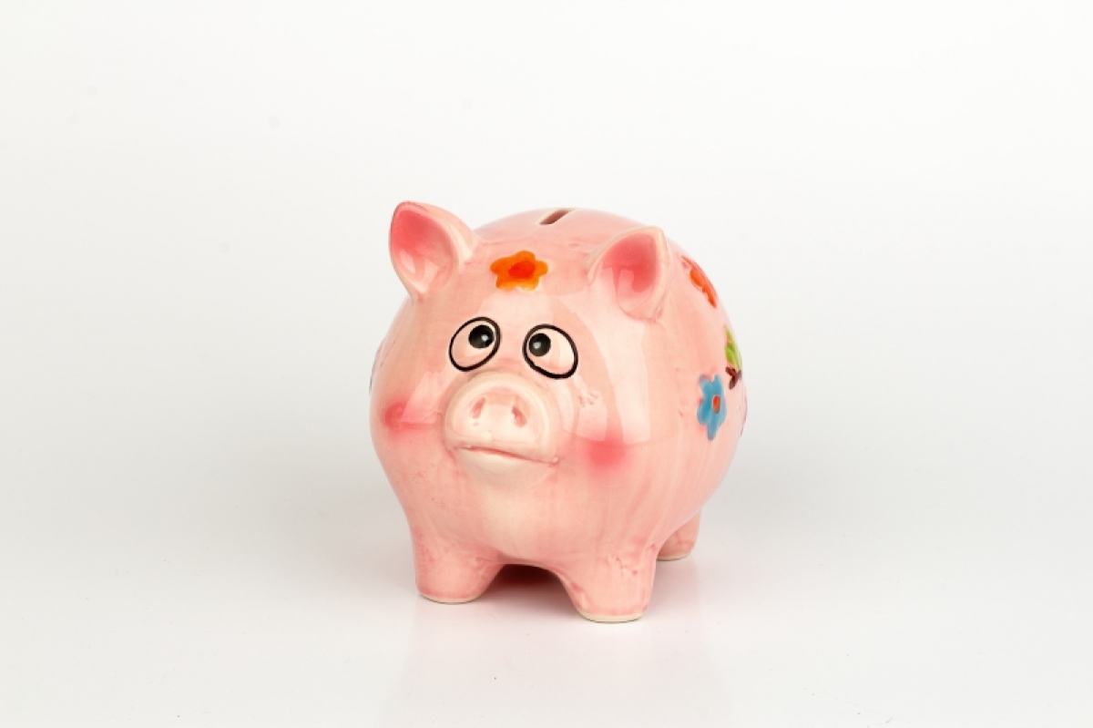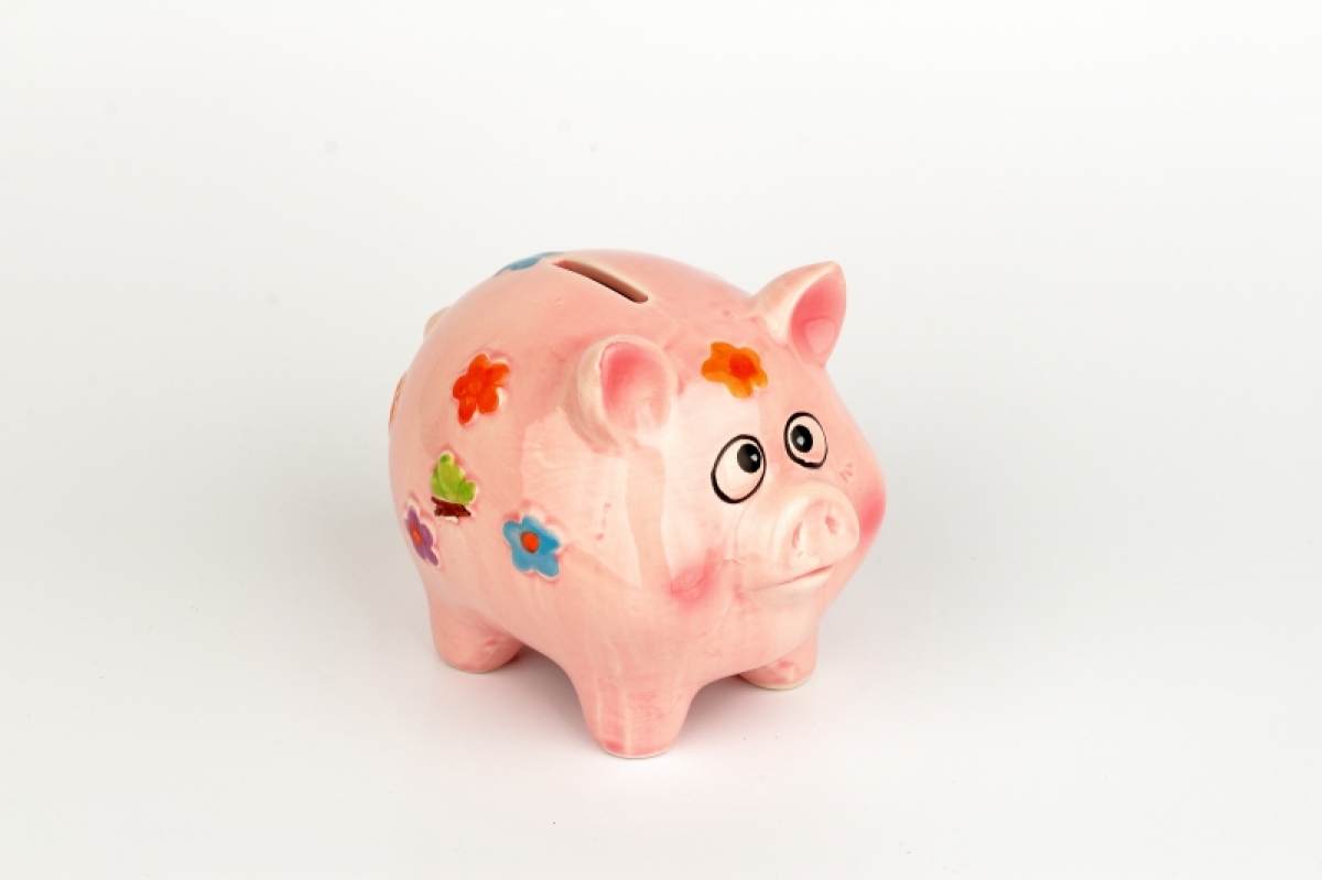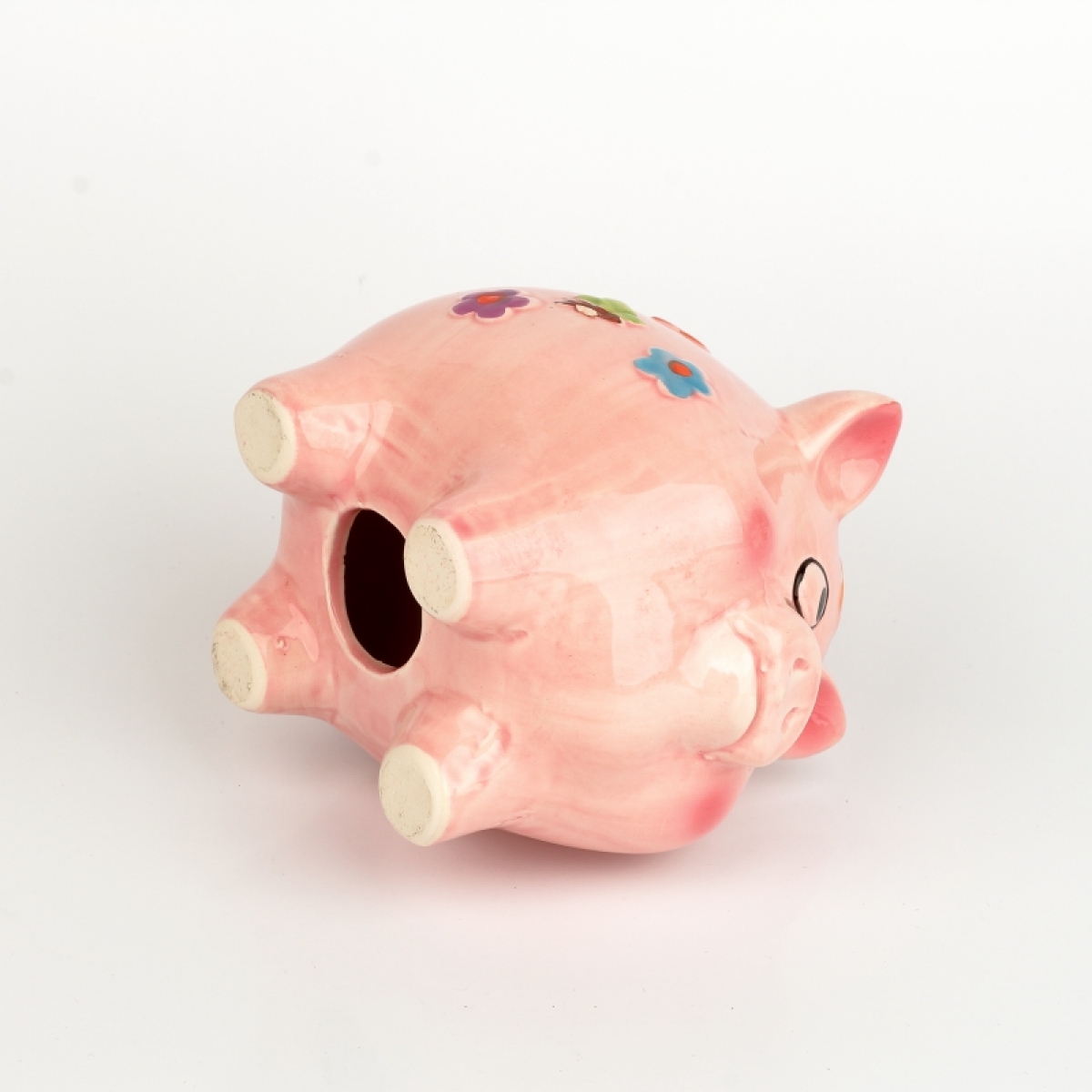 Keramická pokladnička prasiatko je zdobená maľbou s glazúrou.