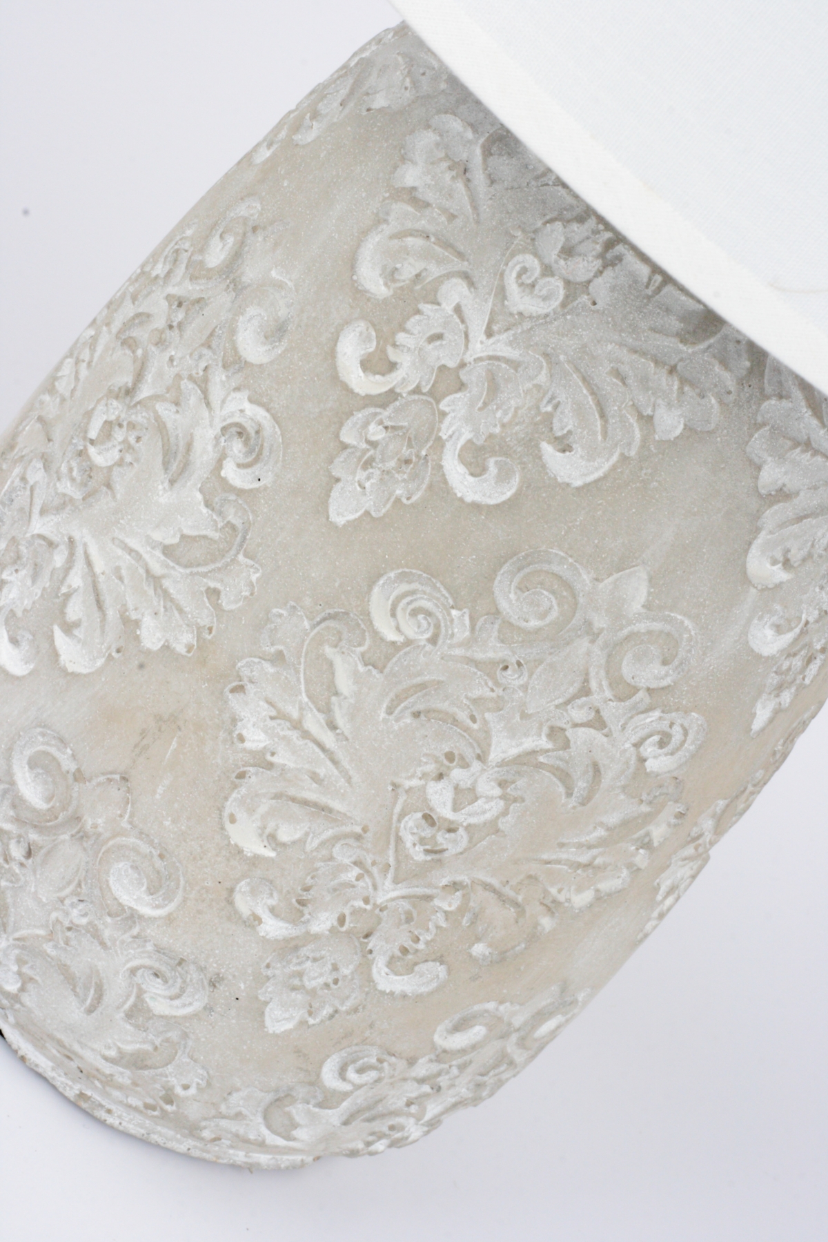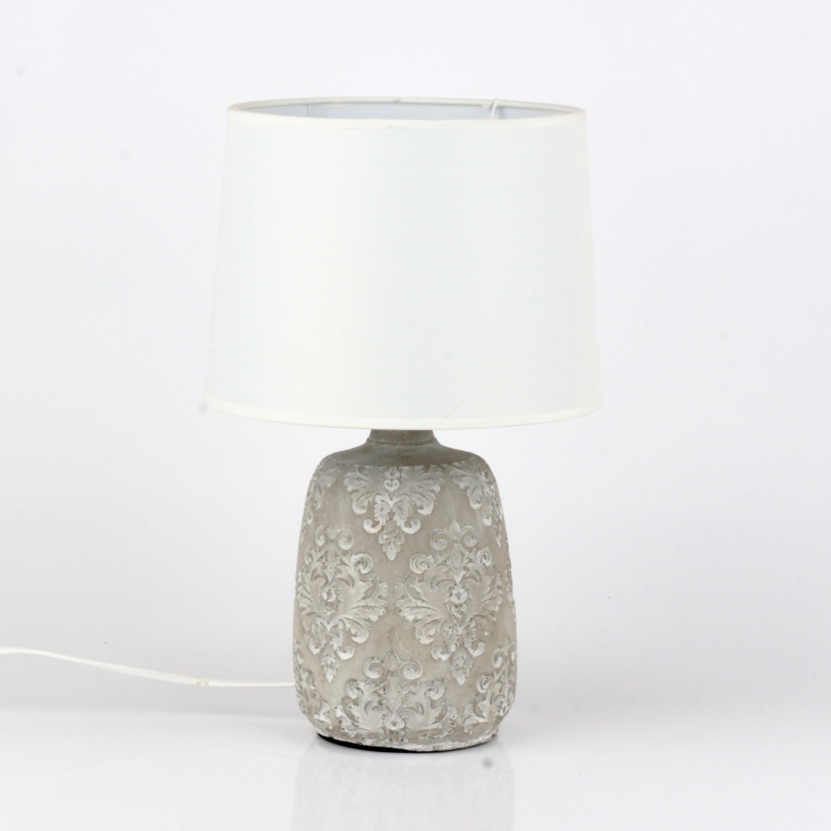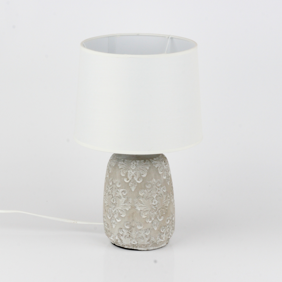 Keramický podstavec lampy má prekrásny zámocký vzor. Jednoduché tienidlo mu dáva príležitosť ešte lepšie vyniknúť.