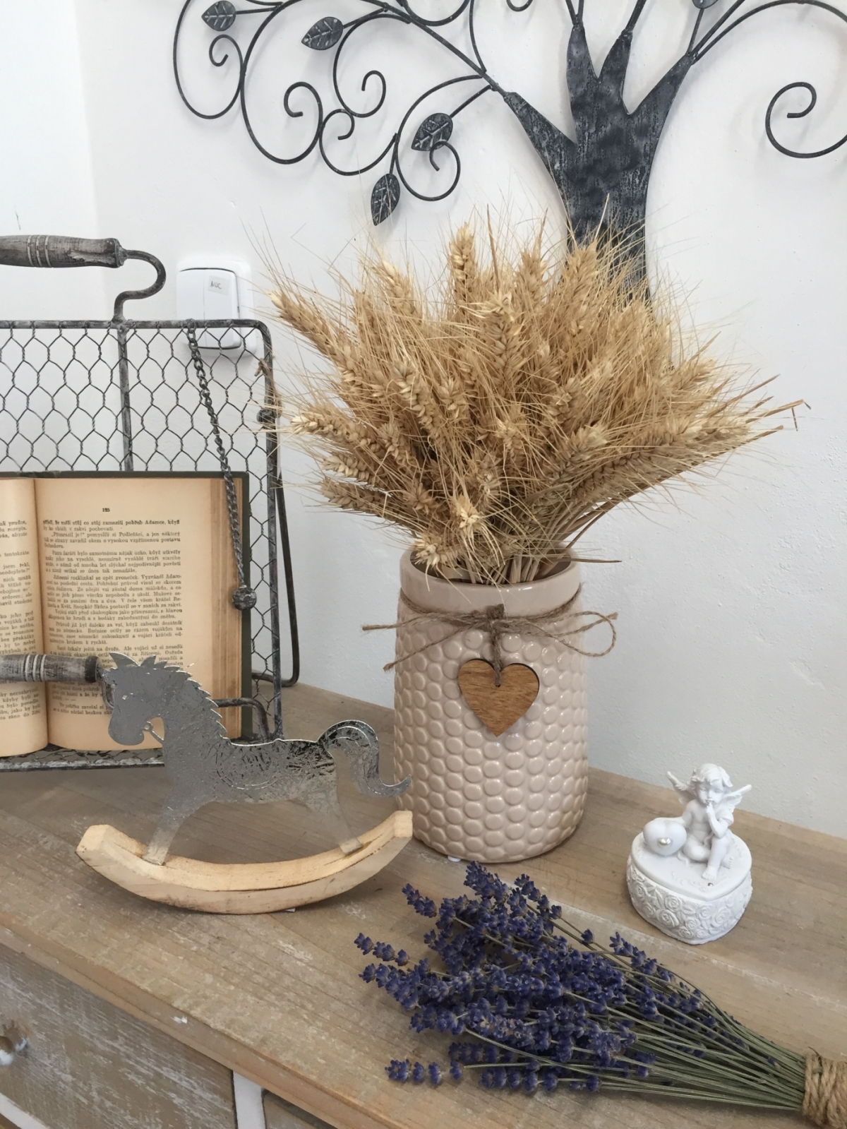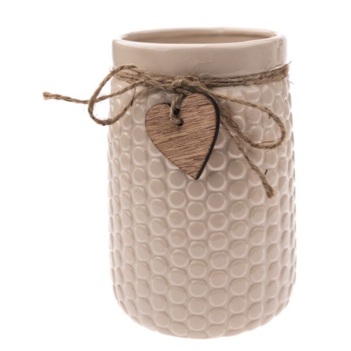 Keramická váza má zaujímavý 3D reliéf a lesklú krémovú glazúru. Je ozdobená jutovou šnúrkou s dreveným srdiečkom.