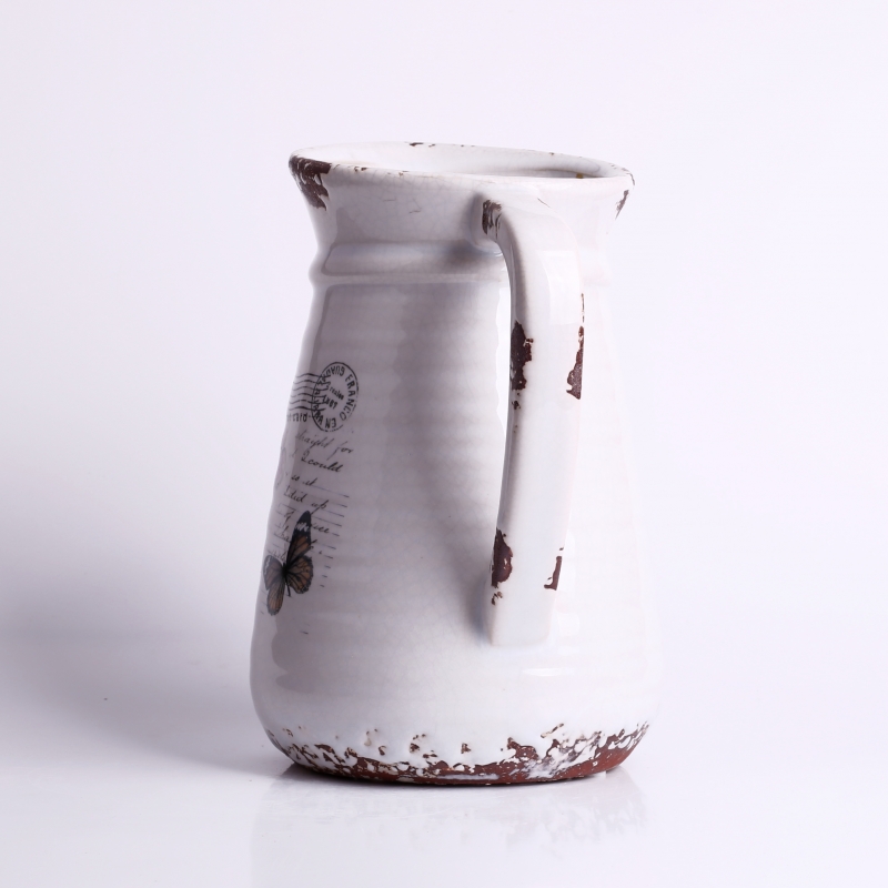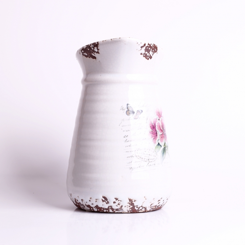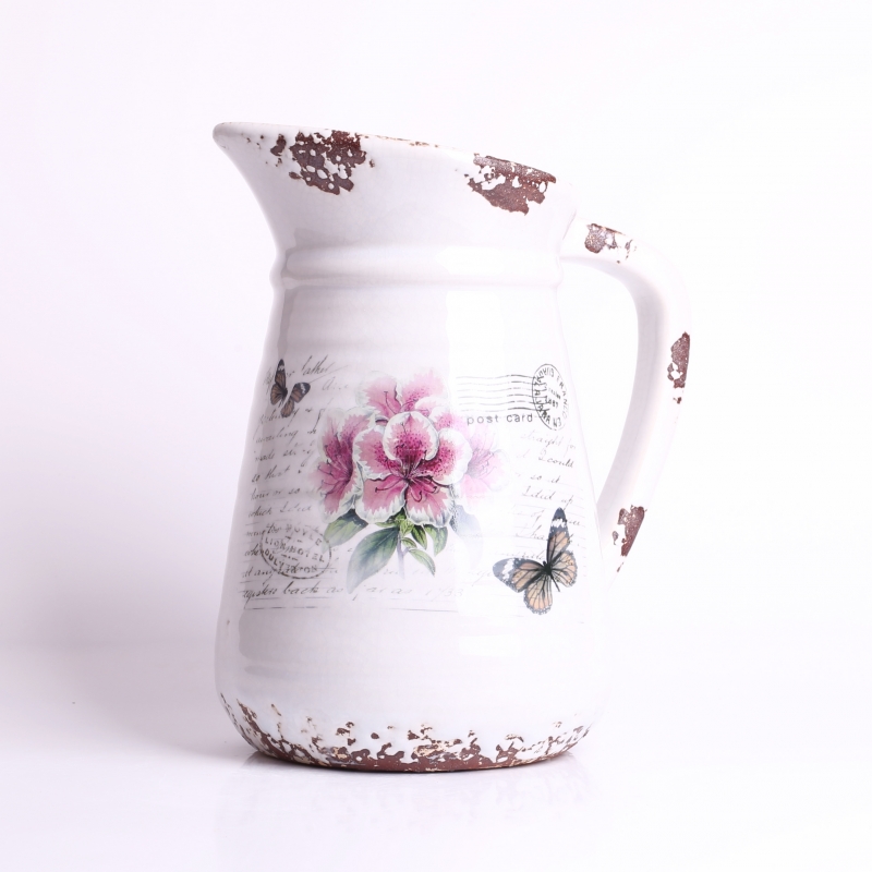 Keramický džbán Romantic 20x16cm s bielou glazúrou, otlčeným vzhľadom, kvetinami a motýliky. Dokonale romanticky zladené, nemyslíte? Ozdobné písmo na pozadí kvetín pôsobí dojmom, ako by bol džbán práve objavený za domom na záhrade.