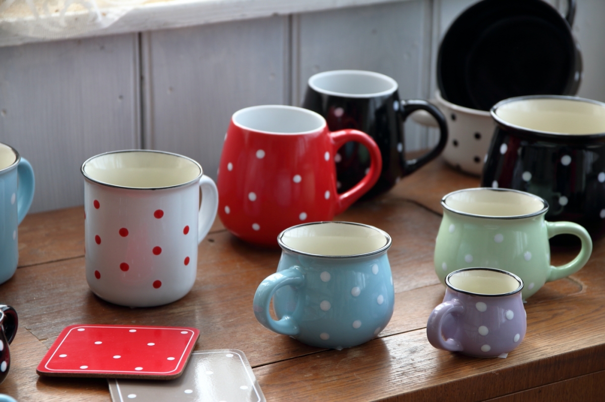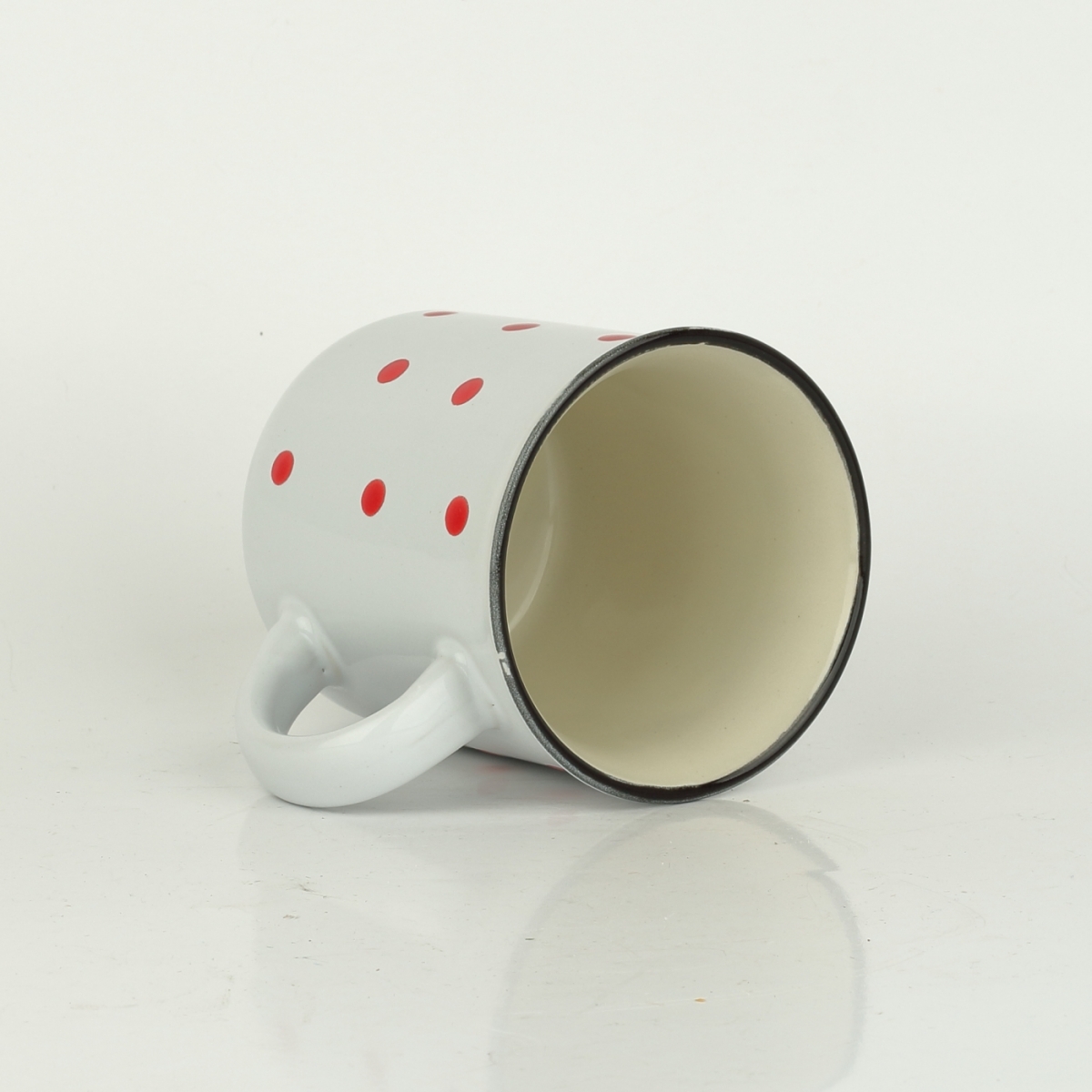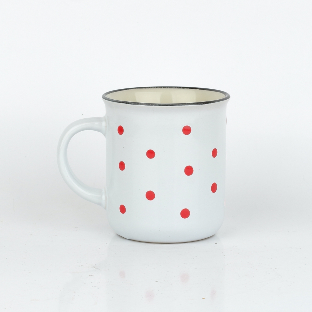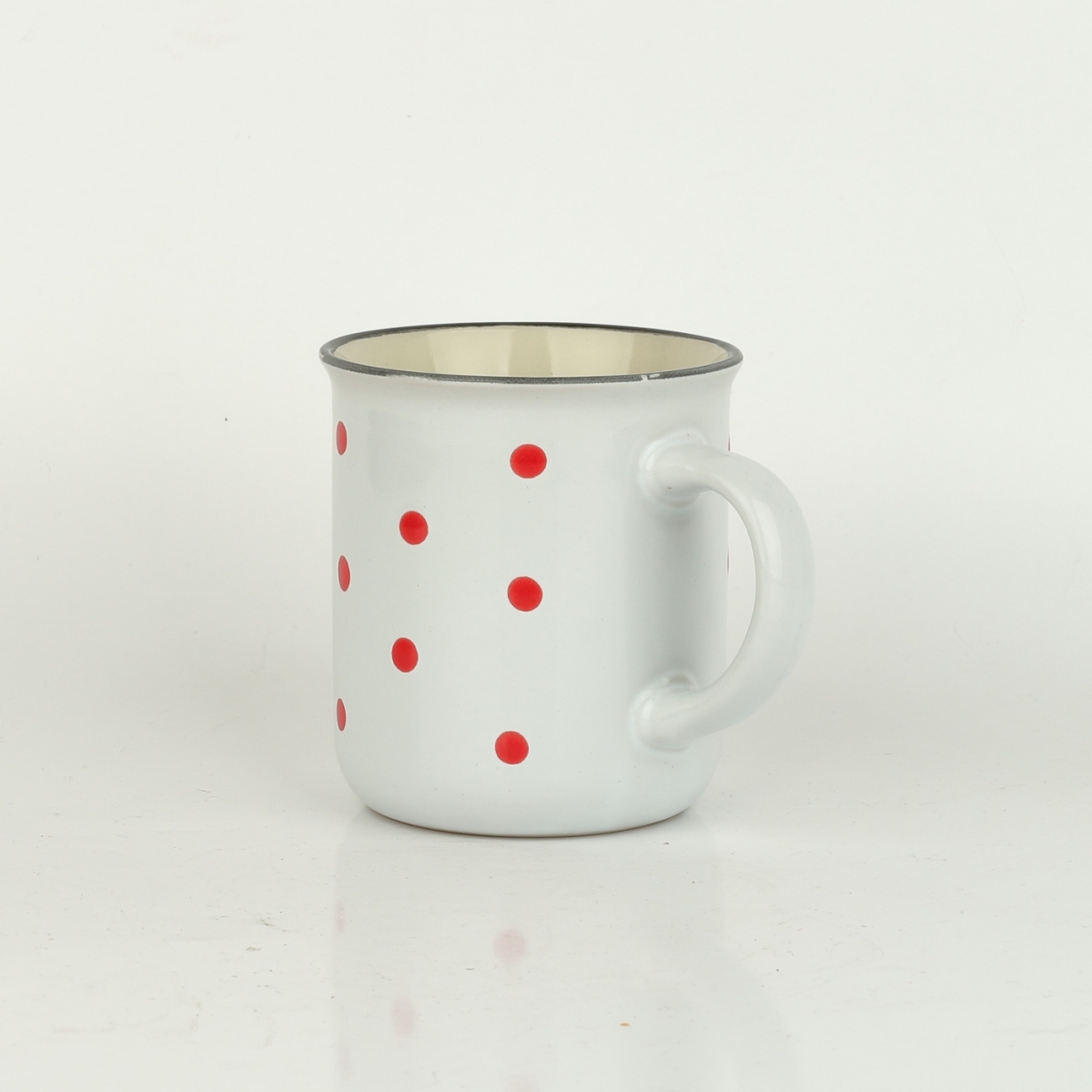 Ak hľadáte keramický hrnček tradičného tvaru, dekoru i farebnosti, prezrite si tento čisto biely s červenými bodkami. Ide o zástupcu tradičnej vidieckej keramiky, ktorý môže pripomínať aj generáciami obľúbený plecháčik. Vďačí za to tenkej čiernej linke na svojom hornom okraji.