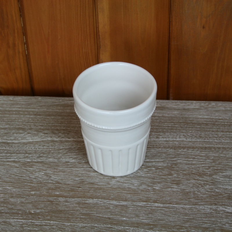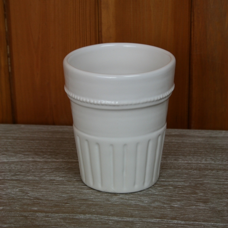 Keramický kalíšok na zubné kefky uzatvára celú sadu kúpeľňových doplnkov v romantickom vidieckom štýle.