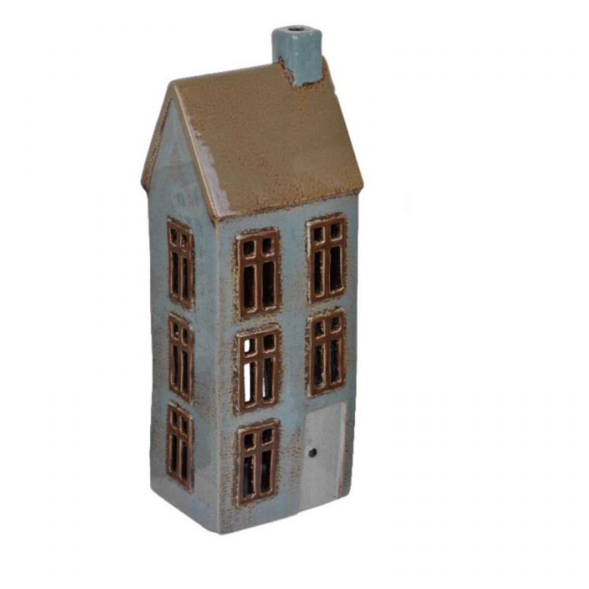 Hľadáte dekoráciu, ktorá je štýlová a zároveň vám vyčarí úsmev na tvári? Obzvlášť v zimnom období a okolo Vianoc určite oceníte tento nádherný keramický svietnik v podobe modrého domčeku na čajovú sviečku.
