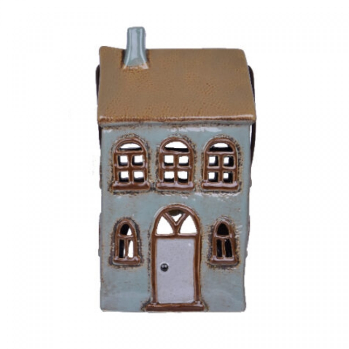 Keramický svietnik v podobe domčeku s rukoväťou v modrej farbe