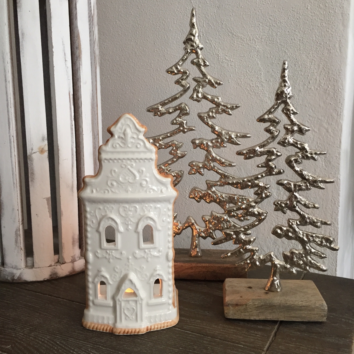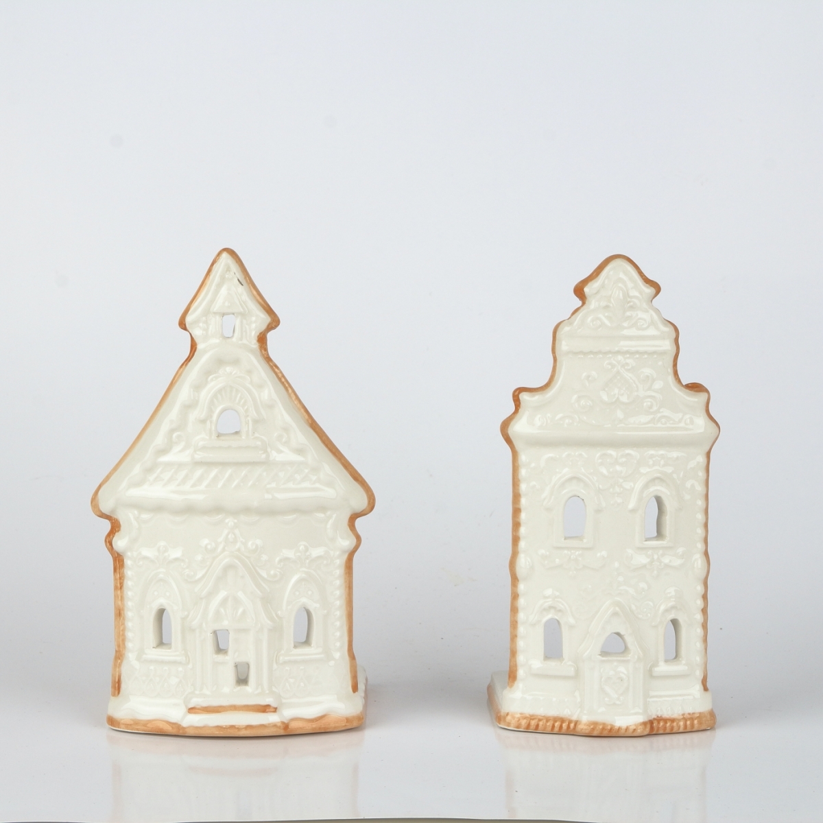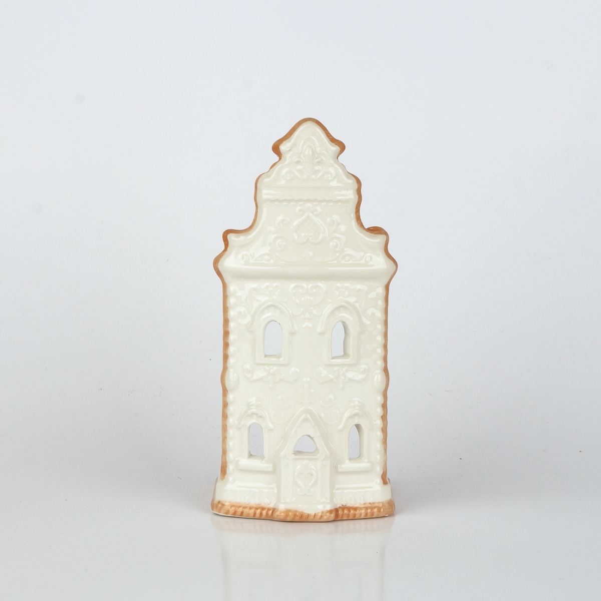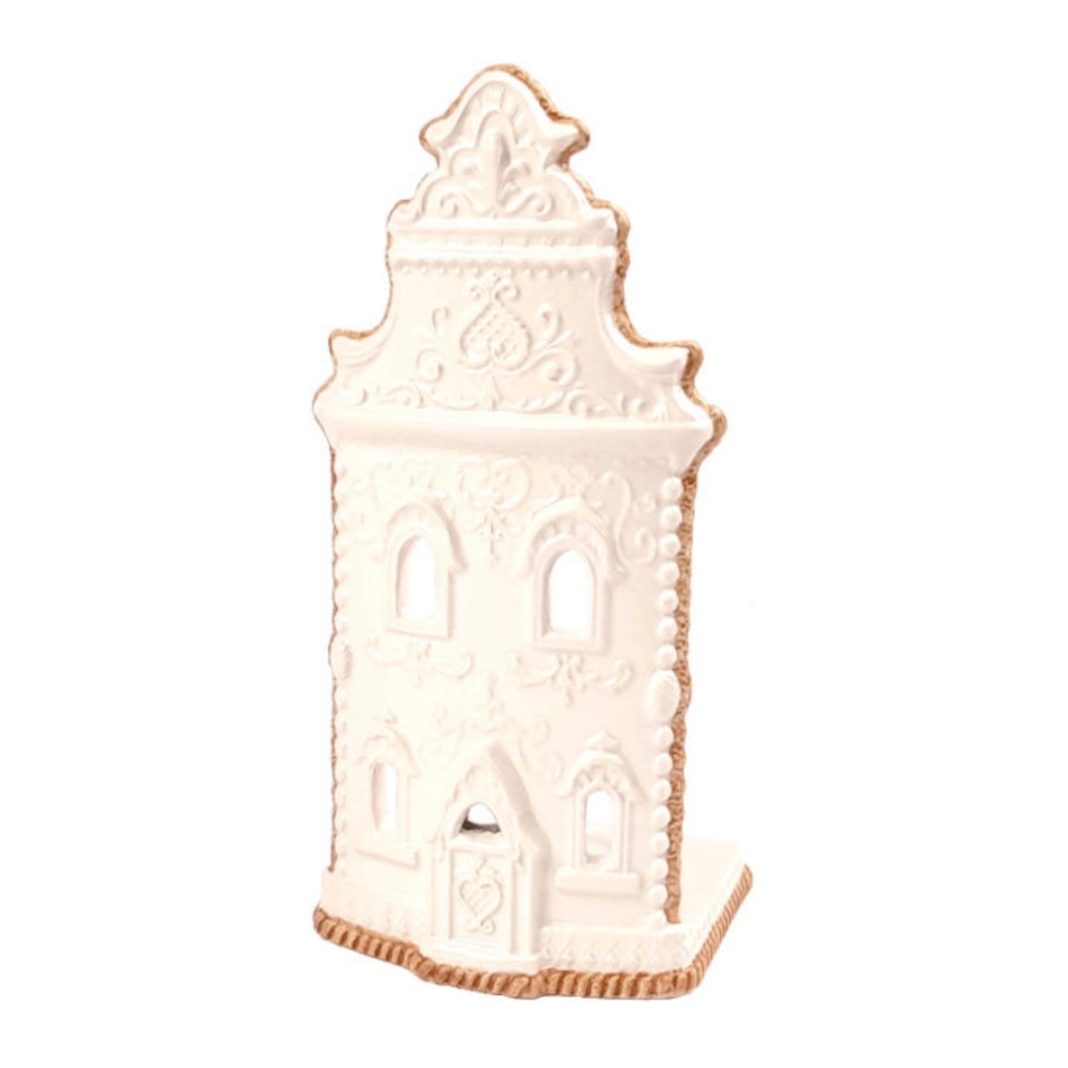 Keramický svietnik v podobe kostolíčku vykrojeného z medového perníka je krásne nazdobený bielkovou polevou. Nejedná sa ale o cukrársky výrobok, na ktorom by ste si s chuťou pochutnali ku káve.