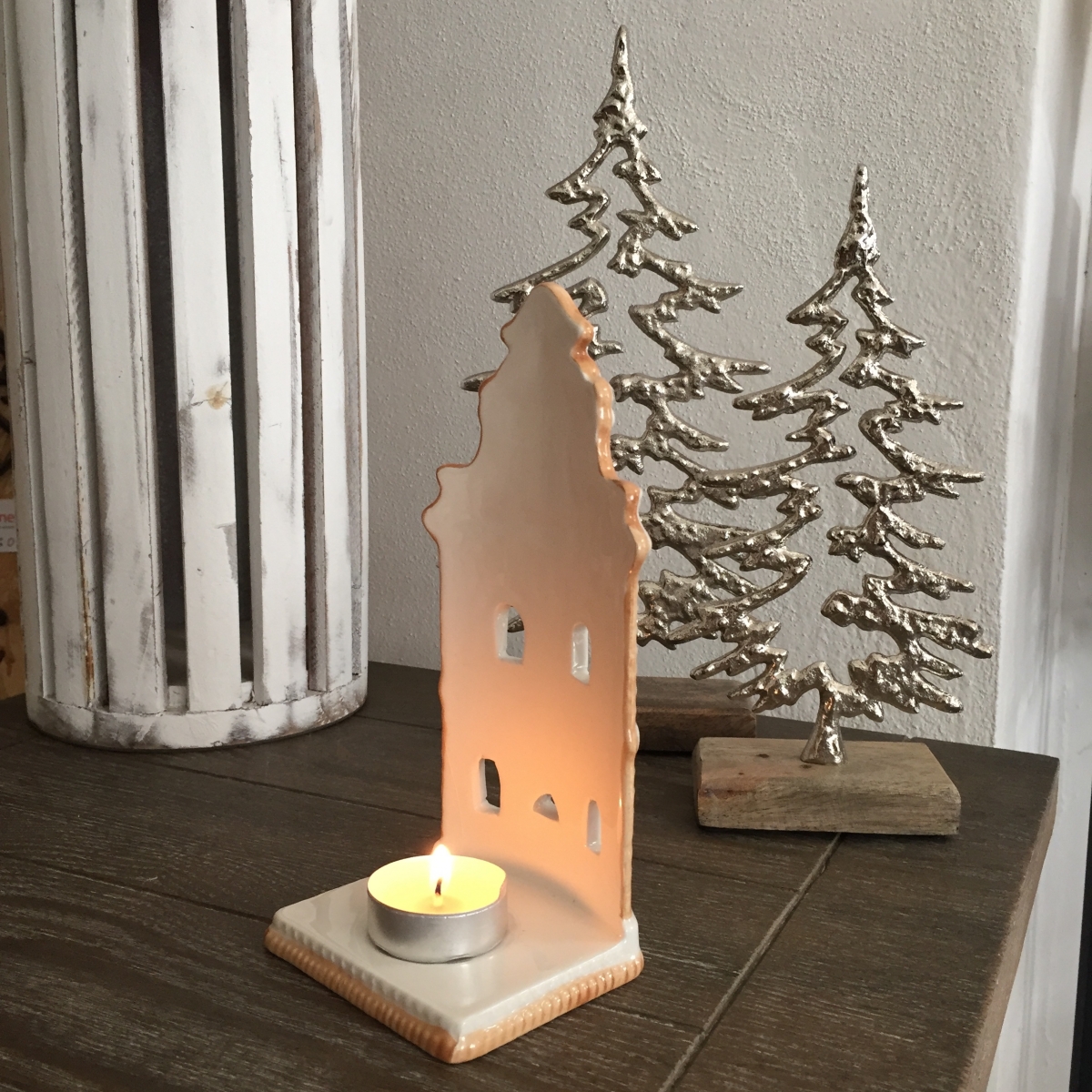 Keramický svietnik s priečelím kostola má na podstavci žliabok na umiestnenie čajovej sviečky. Horiaci plamienok potom bude preblikávať cez okná kostola.