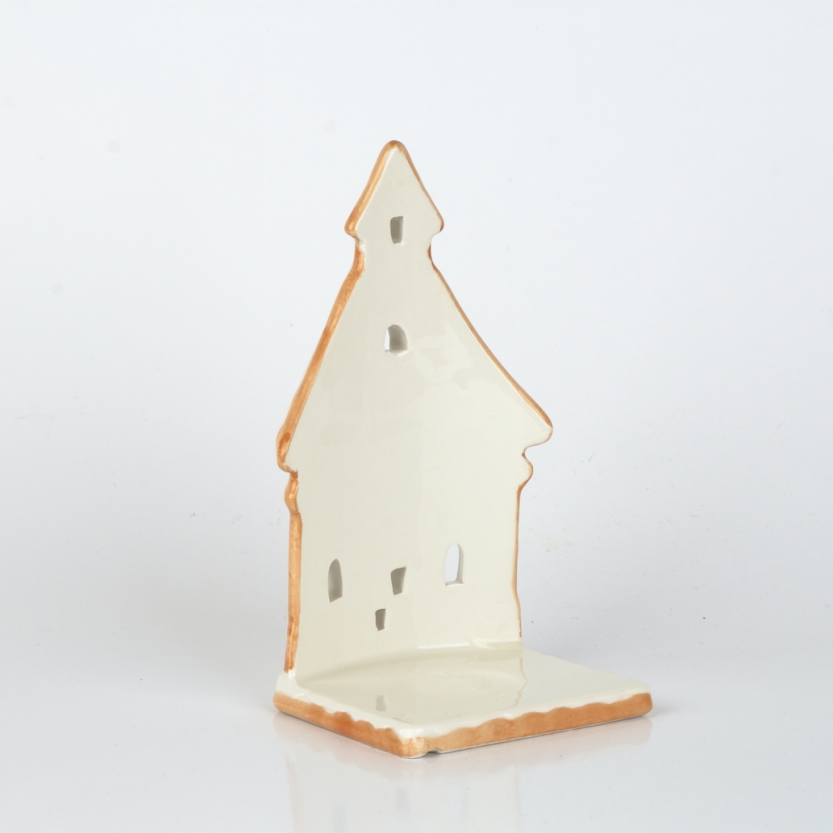Keramický svietnik má podstavec opatrený žliabkom na umiestnenie čajovej sviečky. Horiaci plamienok bude presvitať cez okná perníkovej chalúpky.