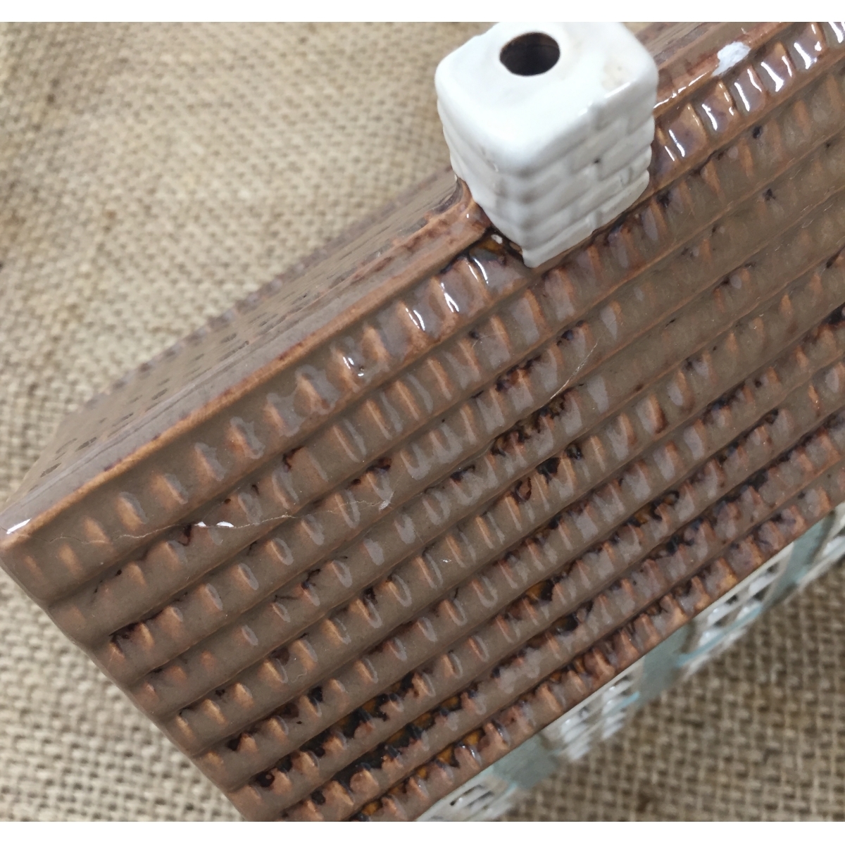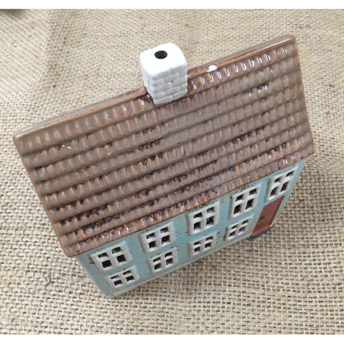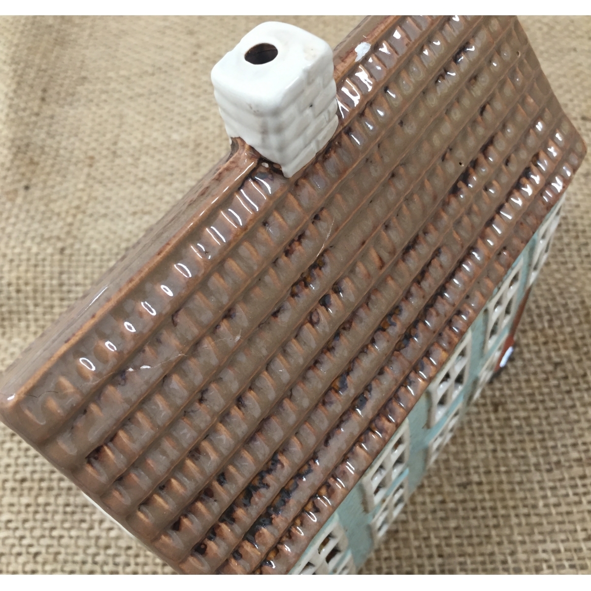 Keramický vianočný domček je vyradený z dôvodu poškodenia na streche viď foto 3, 4, 5. Prasklina sa na prvý pohľad nedá vidieť. Zamaskovať treba pastelkou stačí len oťuk.